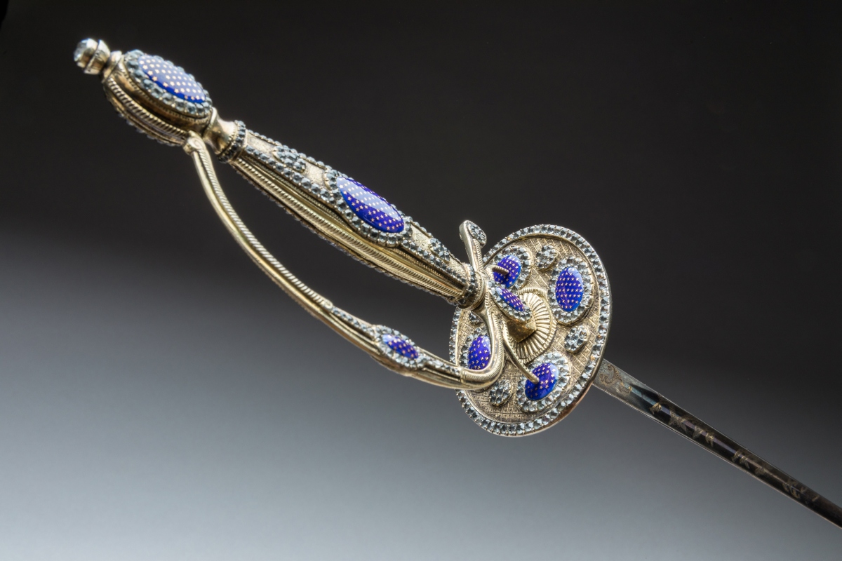 A super fine Louis XVI period silvergit COURT SWORD set with 515 rhinestones. Decorated with blue enamel medallions with gold stars. C. 1785.