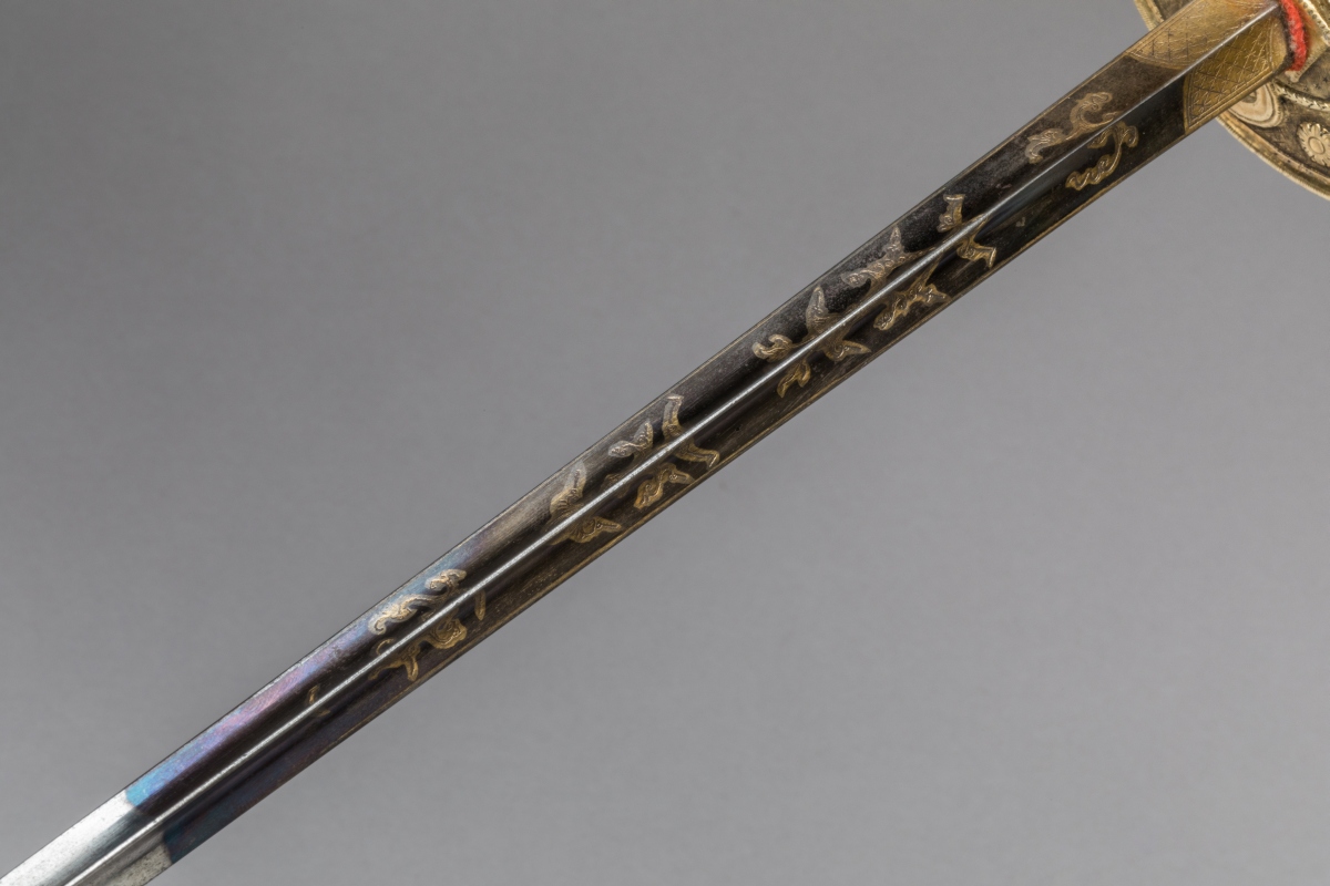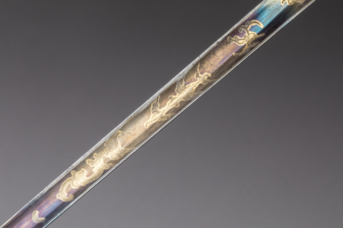 Lame triangulaire gravée, dorée et bleuie au tiers à décor de feuillages et de rinceaux feuillagés.