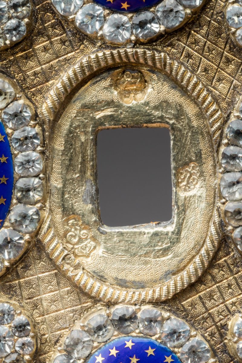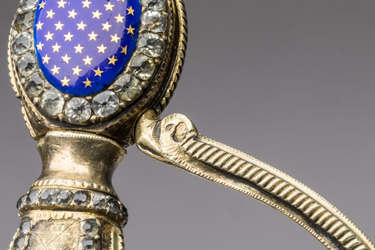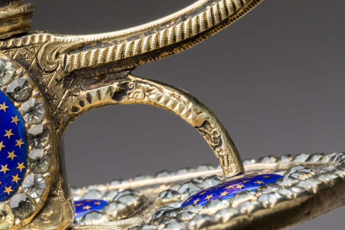 Monture en vermeil ciselé enrichie de pierres du Rhin taillées à facettes façon diamant, émail, or. Pommeau en olive à bandes striées sur les côtés, garni sur le devant et le dos de deux médaillons ovales en émail bleu constellé de petites étoiles d'or, enrichi sur le pourtour d'une suite de petites pierres taillées à facettes.