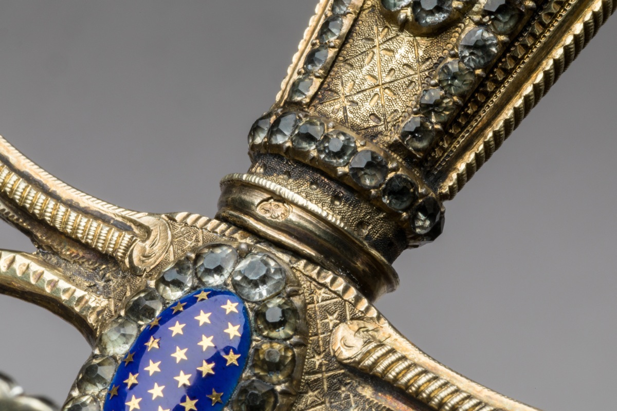 Les similitudes sont flagrantes sur le travail d'orfèvrerie de la garde. La technique tout d'abord, l'argent doré travaillé à pointes de diamant, mais surtout, l'ajout de motifs incrustés de pierres taillées à facettes et de médaillons émaillés. Ces médaillons d'émail bleu à décor de semis d'étoiles d'or sont identiques sur les deux épées. Autre travail très proche, le guillochage de la branche de garde et du quillon, ainsi que la ciselure et le décor du dessous du clavier.
