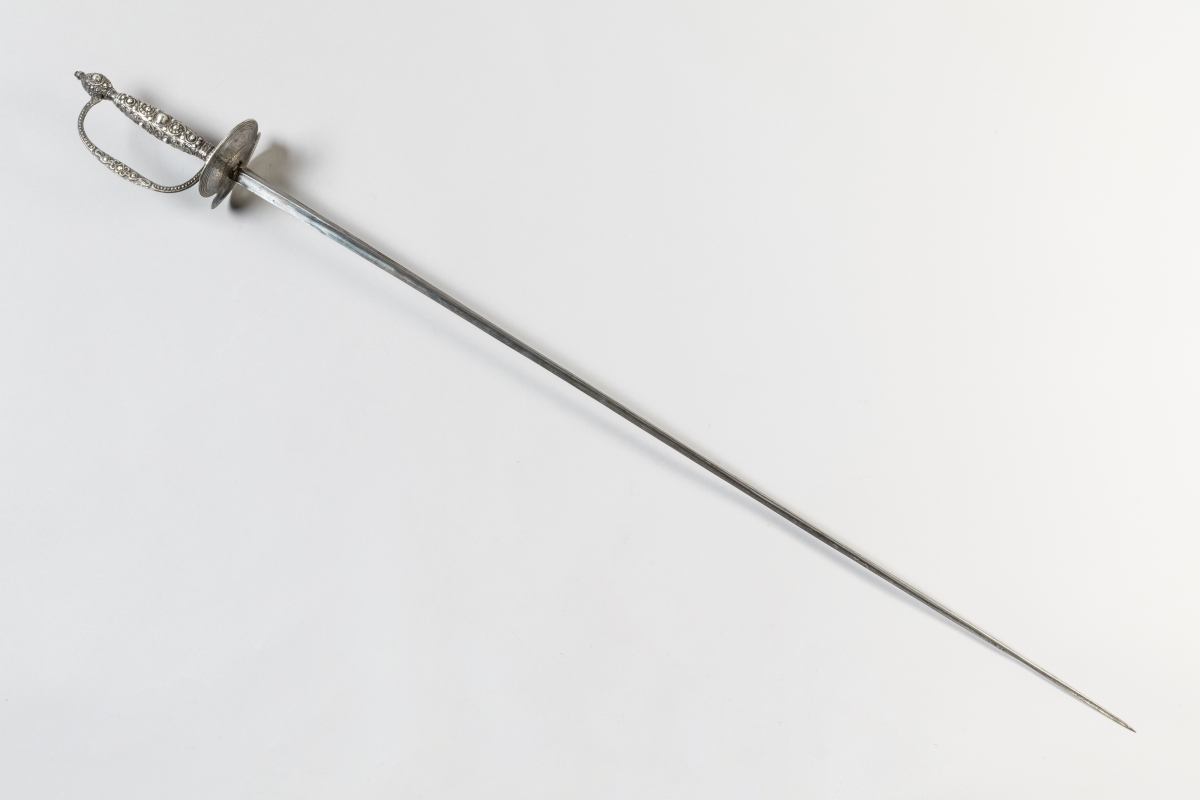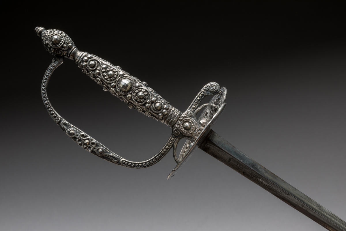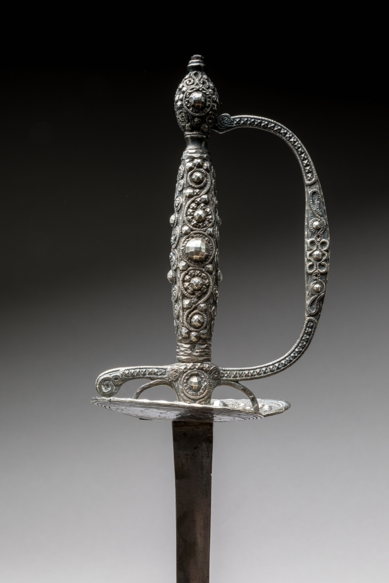 Fusée et monture en argent. Pommeau en olive. Garde à une branche et pas d'âne. Coquille bivalve. L'ensemble profusément orné de motifs en fort relief taillés en pointes de diamant, de chapelets de petits motifs à pointes de diamant également, de rinceaux, d'entrelacs et de fleurs. Lame triangulaire.