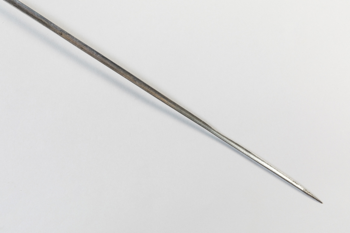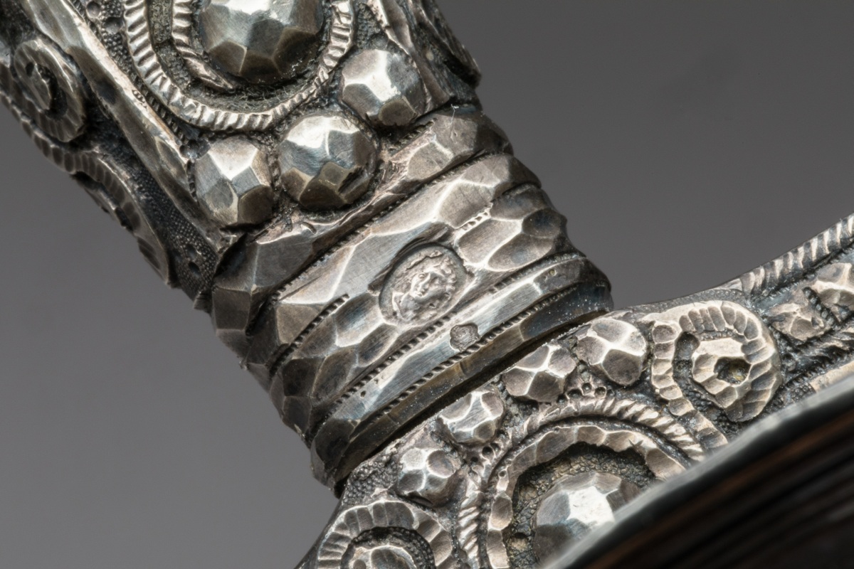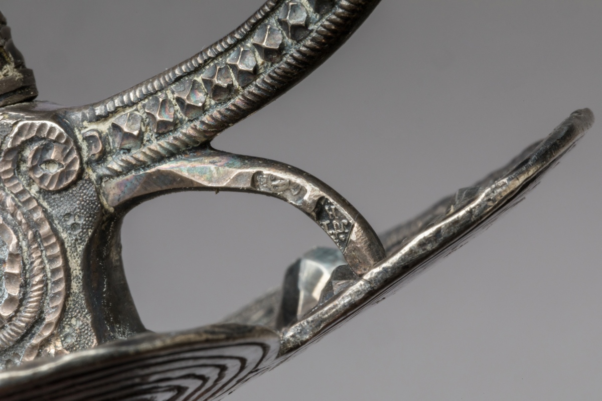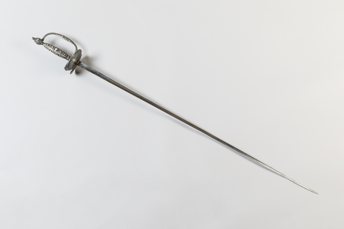 Fusée et monture en argent. Pommeau en olive. Garde à une branche et pas d'âne. Coquille bivalve. L'ensemble profusément orné de motifs en fort relief taillés en pointes de diamant, de chapelets de petits motifs à pointes de diamant également, de rinceaux, d'entrelacs et de fleurs. Lame triangulaire.