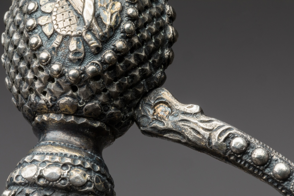Fusée et monture en argent entièrement ciselé à pointes de diamant. Garde à une branche, pas d'âne et plateau repercé.