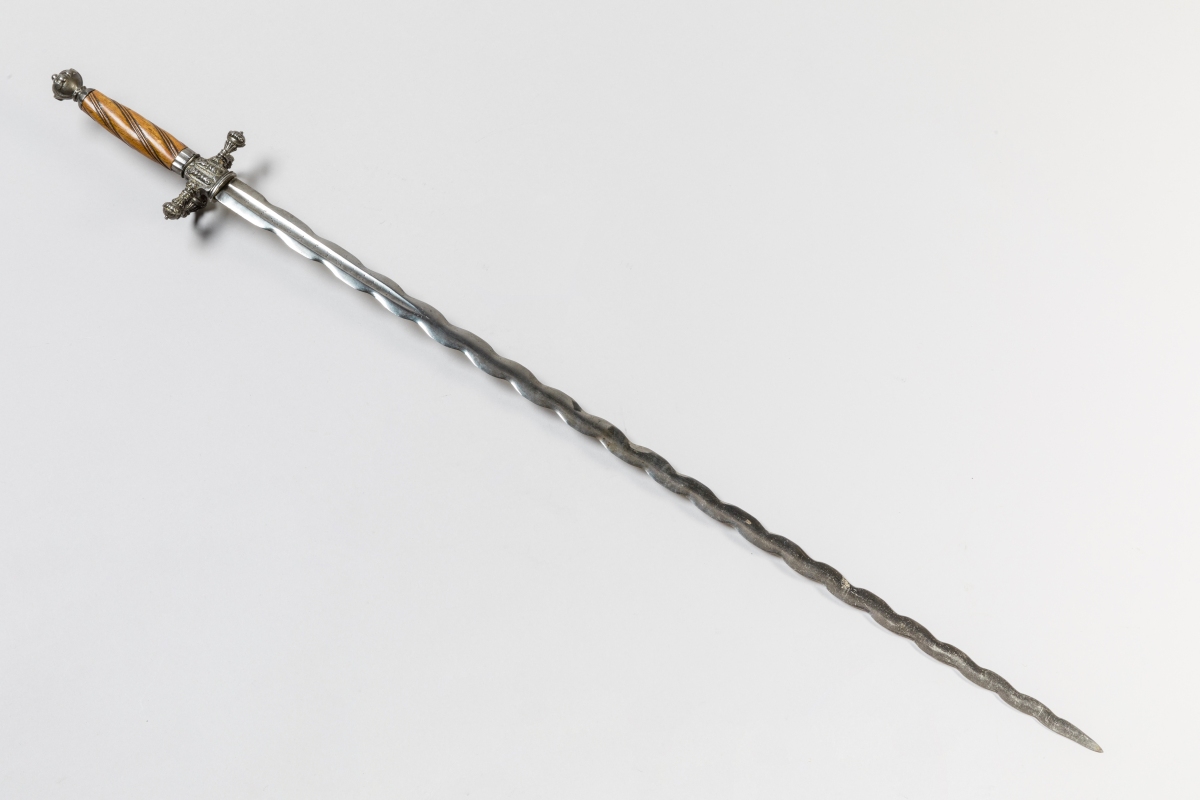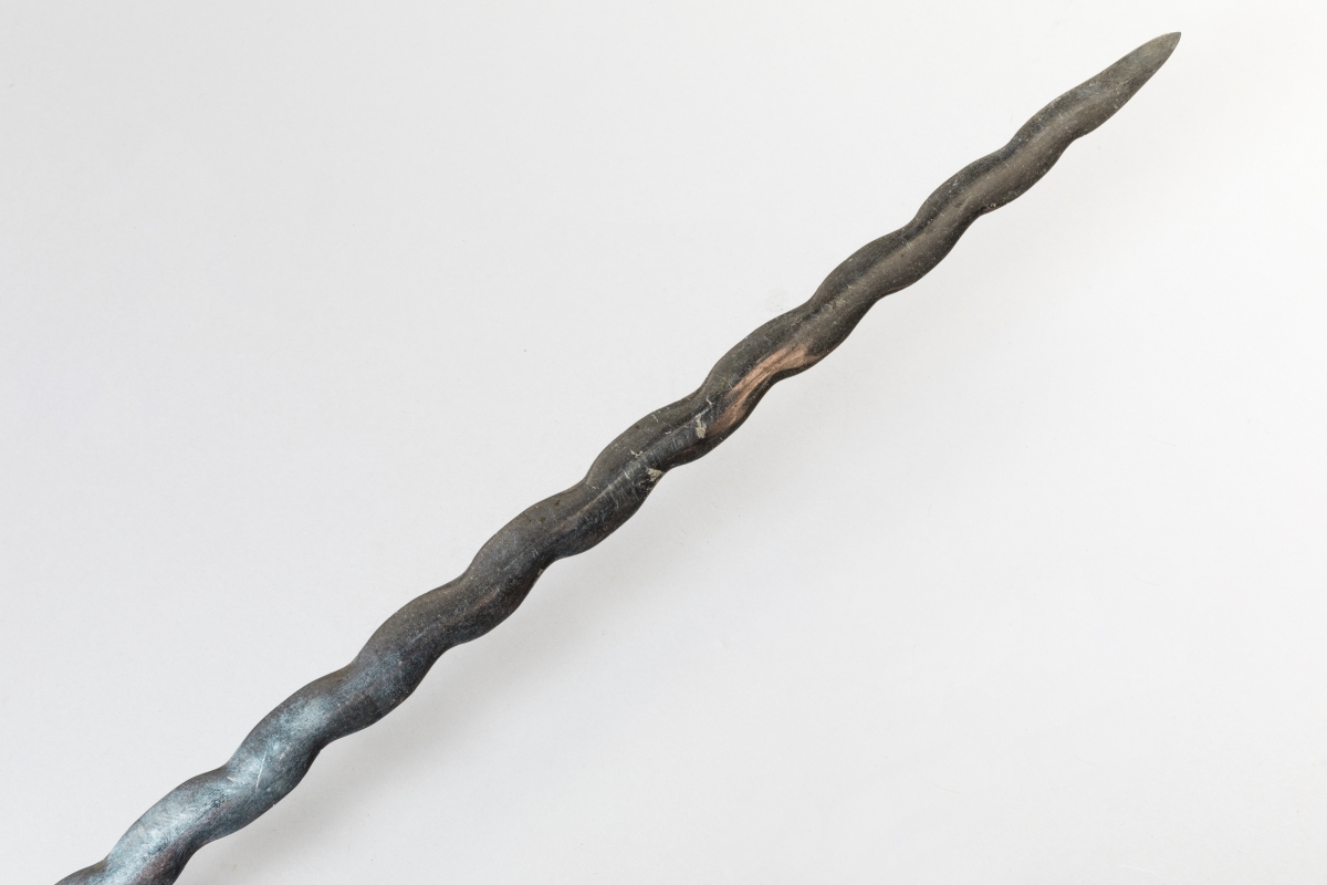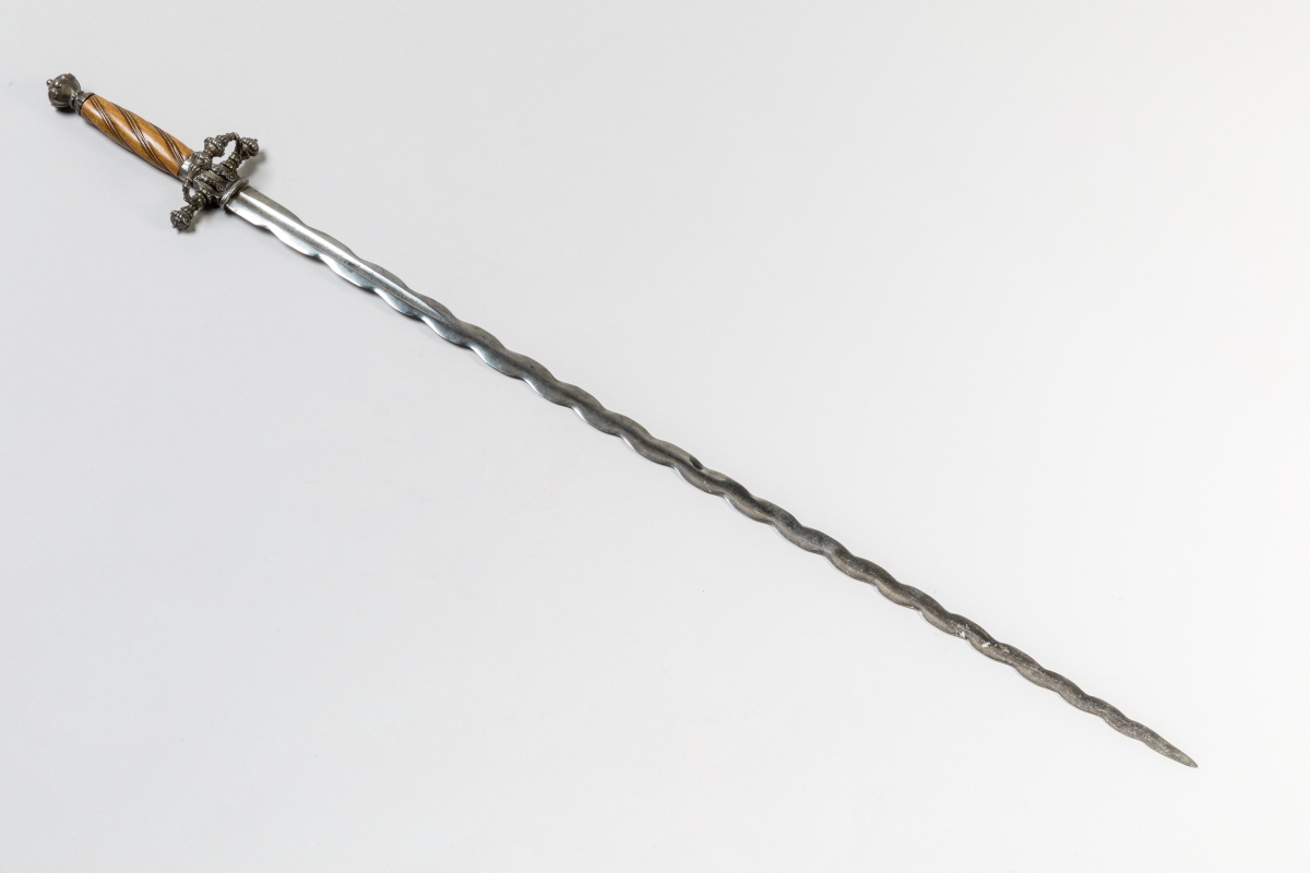Monture en fer ciselé en fort relief. Fusée postérieure en bois clair verni, ornée de rainures obliques. Pommeau en urne couverte. Garde à anneau et deux quillons droits boulés en suite, joliment ciselée de rinceaux, chapelets perlés et enroulement. Belle lame flamboyante à 18 ondulations et gouttière au talon, signée " SEBASTEIAN " sur une face et " HERNANTER (?) " sur l'autre face.
