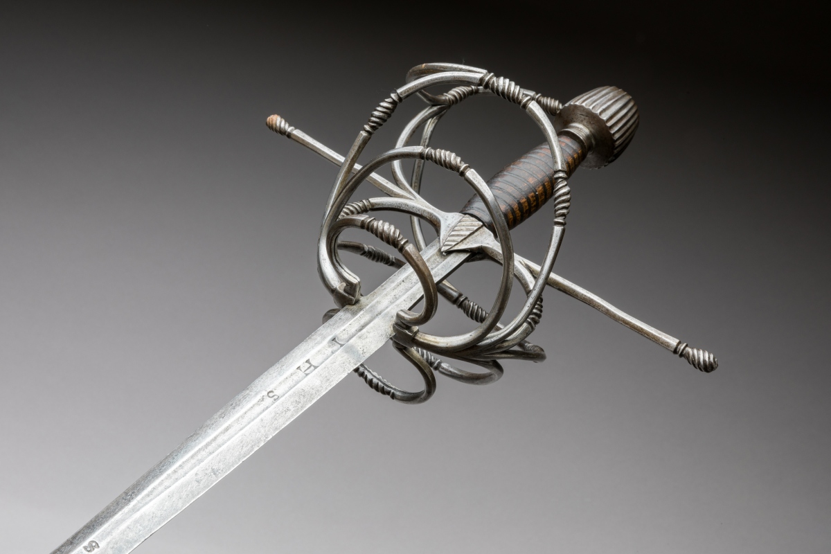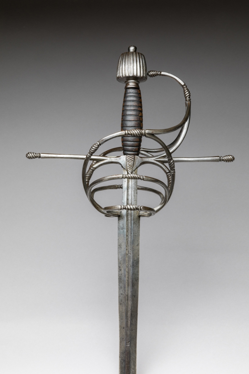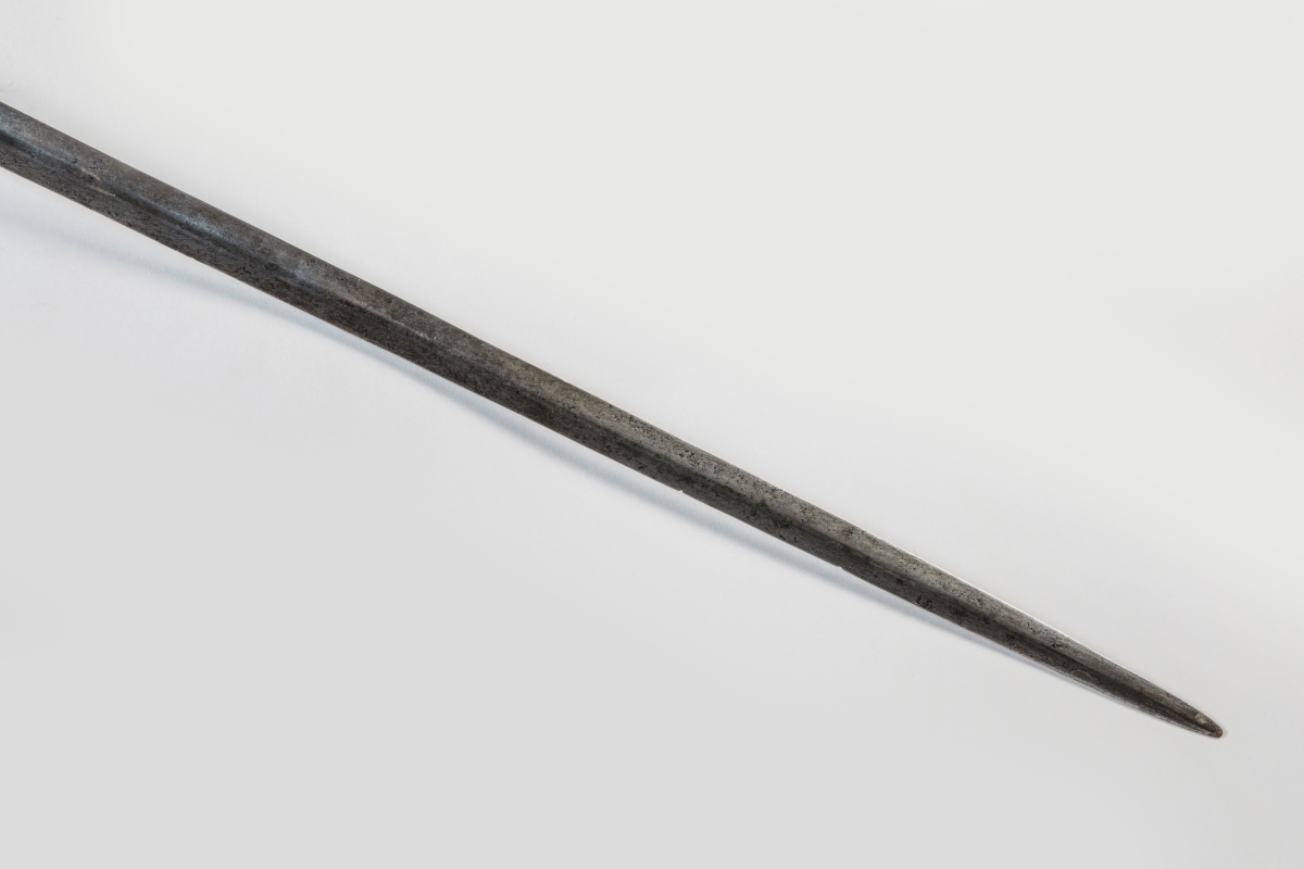 Pommeau cannelé tronconique. Fusée en bois. Garde à une branche et deux longs quillons droits finissant en torsade, à anneau et multi branches entrecoupées de parties torsadées. Longue lame droite à gouttière au talon marqué "IHS".