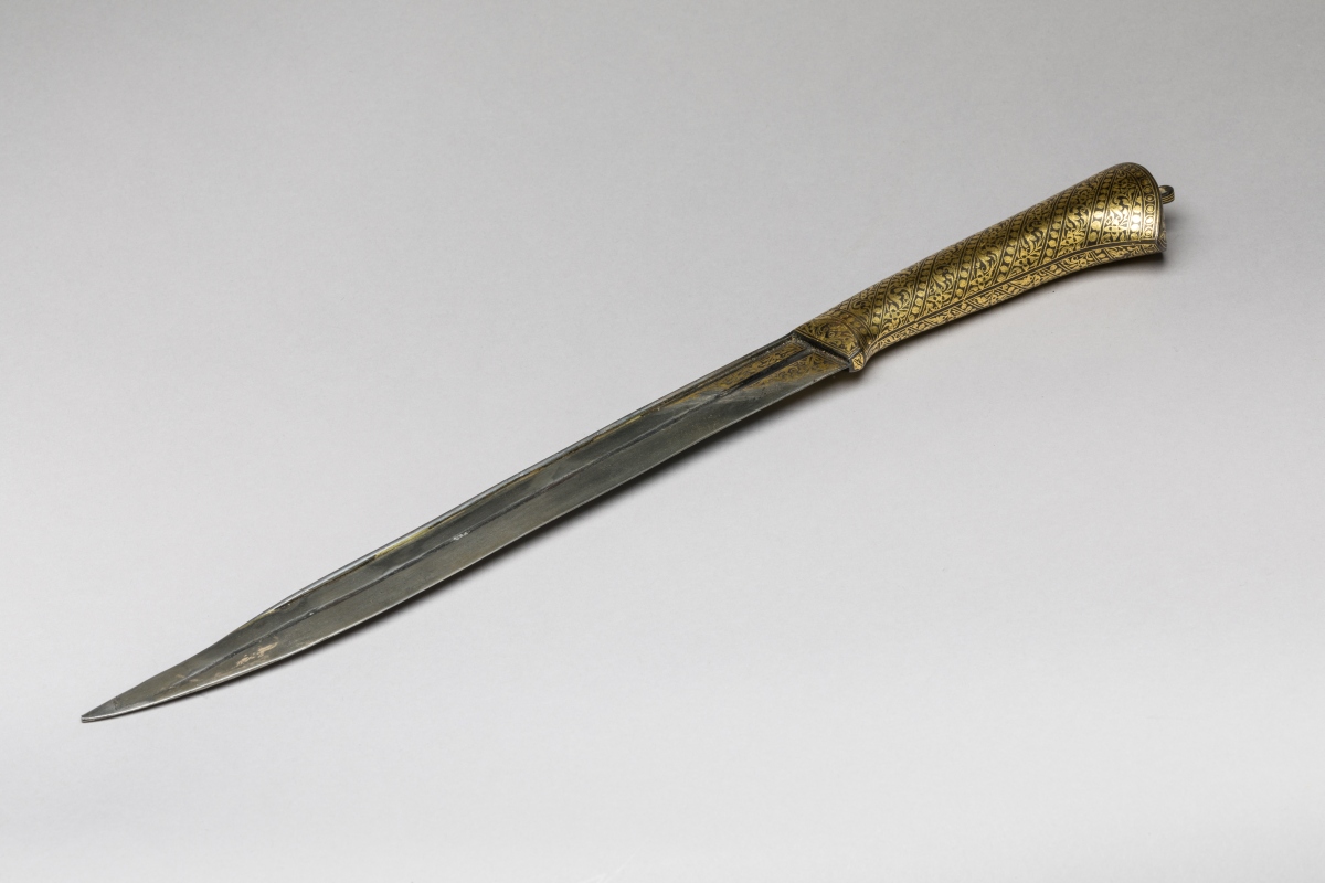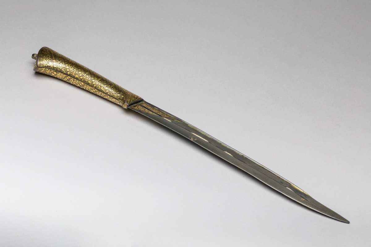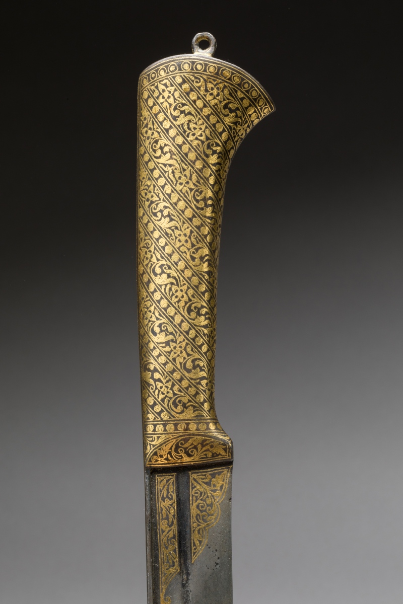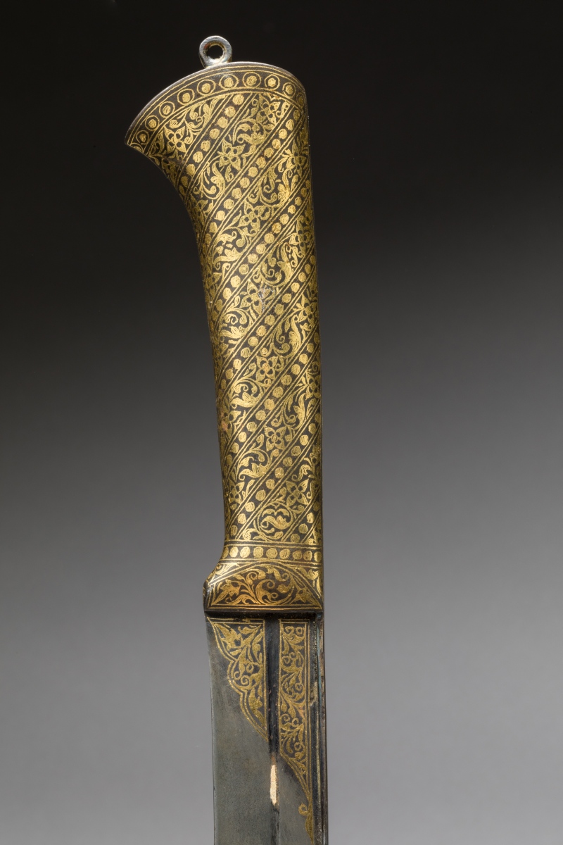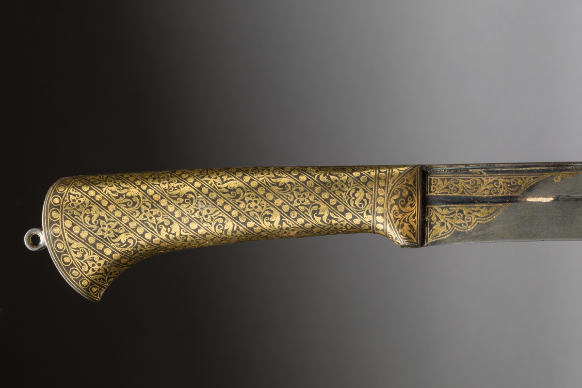 Poignée en fer surmontée d'un petit anneau entièrement et joliment damasquiné d'or, à décor strié de rinceaux séparés de frises de perles. Lame à dos arrondi légèrement cintrée, à gouttière, damasquinée d'or en suite au talon.