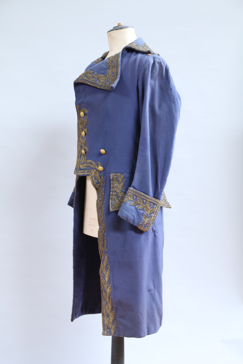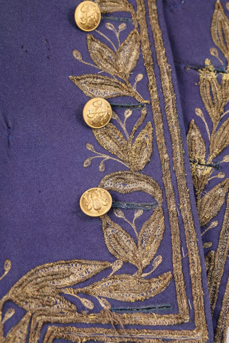 HABIT FANTAISIE, 6 BOUTONS de forme ronde bombés en métal doré aux attributs pontificaux: tiare et clefs de saint Pierre. Drap de laine bleu brodé or de feuillages. Les boutons marqués du fabricant AM et Cie Paris.