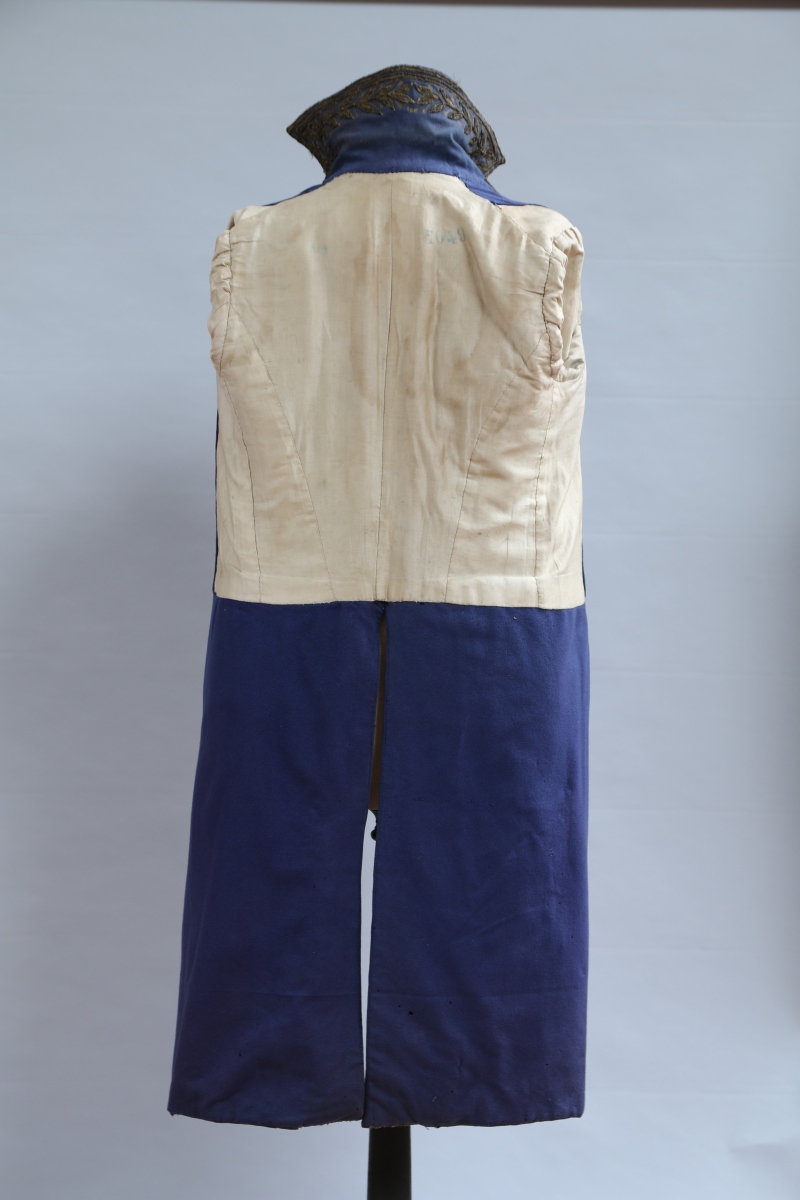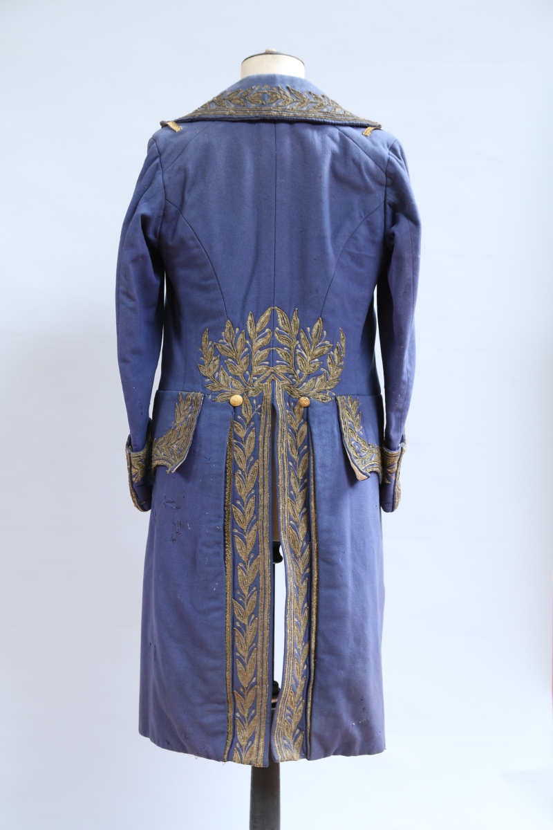 Les boutons portent les armes de la Maison Grimaldi. Si ces dernières n'ont jamais été modifiées, les tenants quant à eux nous offrent la possibilité d'une datation. Ici, les deux Frères Mineurs ne brandissent pas leur épée au-dessus de leur tête comme c'est le cas actuellement. Or il semble que les moines, dans cette position, n'aient été utilisés au XIXe siècle que par les princes Honoré V (1778-1841), Florestan Ier (1785-1856) et Charles III (1818-1889). En témoigne les frappes numismatiques monégasques de cette époque. Cet habit datant de la seconde moitié du XIXe siècle, il a vraisemblement été réalisé entre 1856 et 1889.
