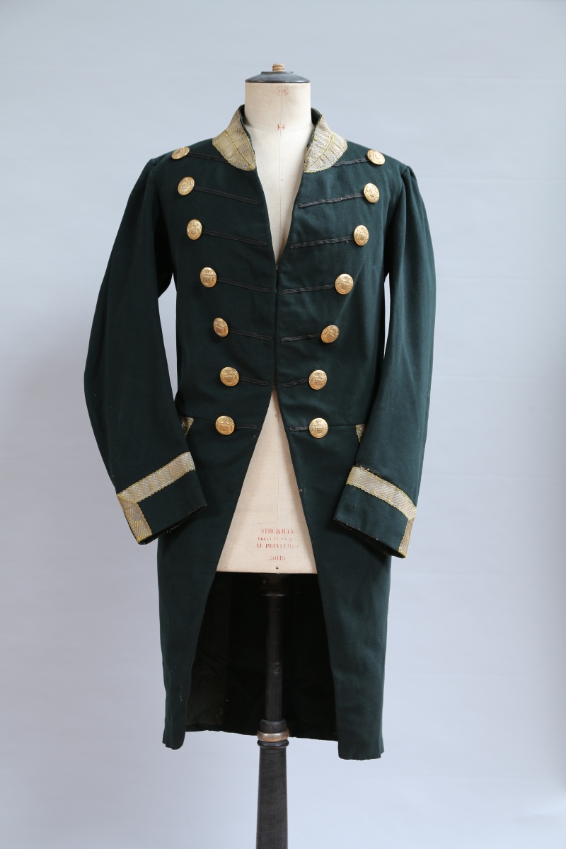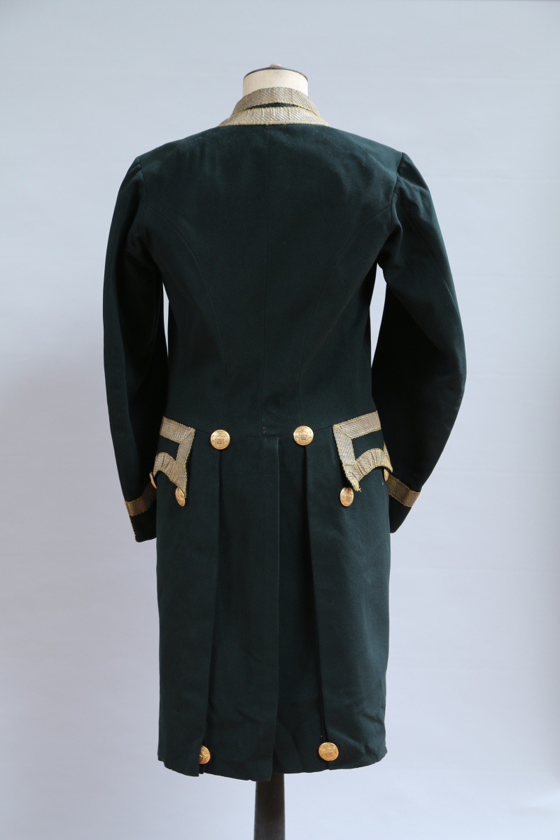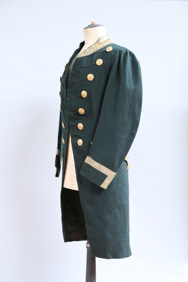 HABIT DE LAQUAIS, 24 boutons de forme circulaire légèrement bombés en bronze doré aux armes de la Maison GRIMALDI. Drap de laine vert galonné argent.