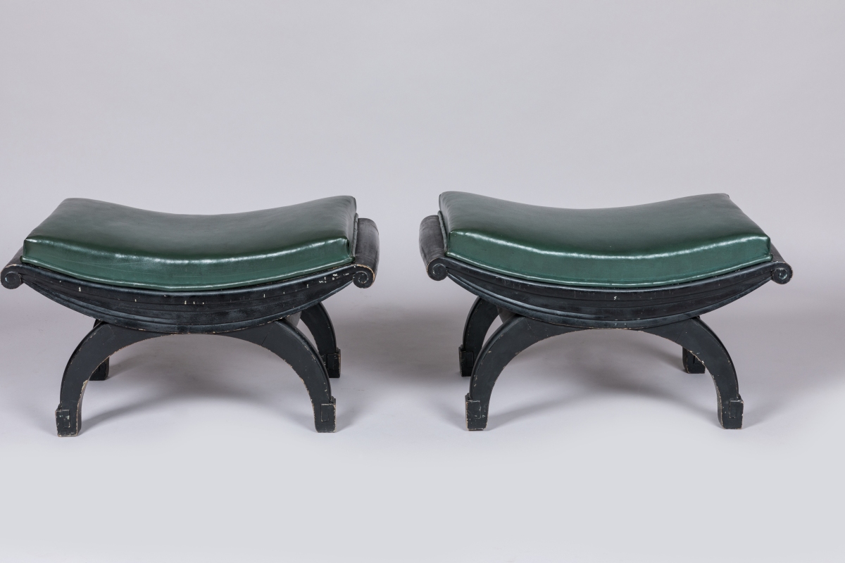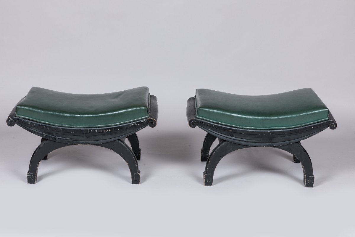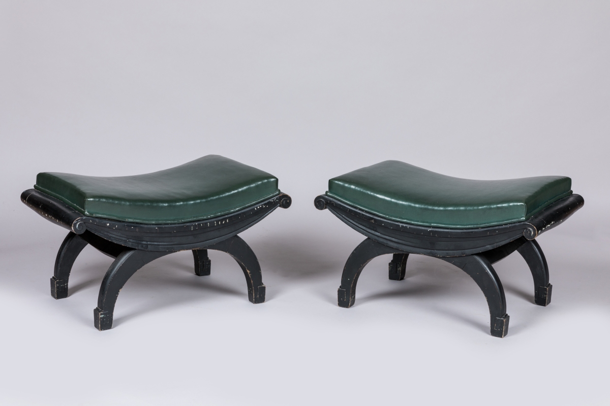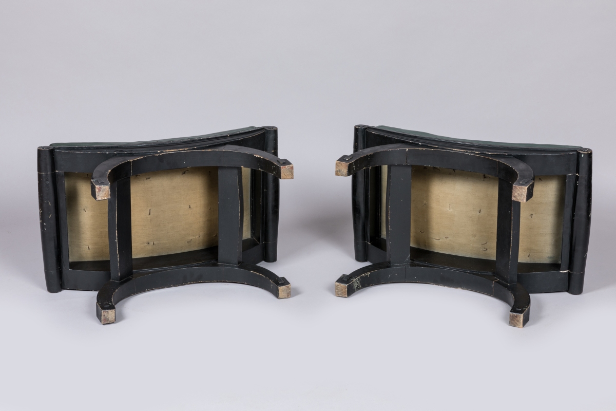 en bois noirci, le piétement en double arcature repose sur une assise à motif plissé plat et de volutes. Garnis de cuir vert.