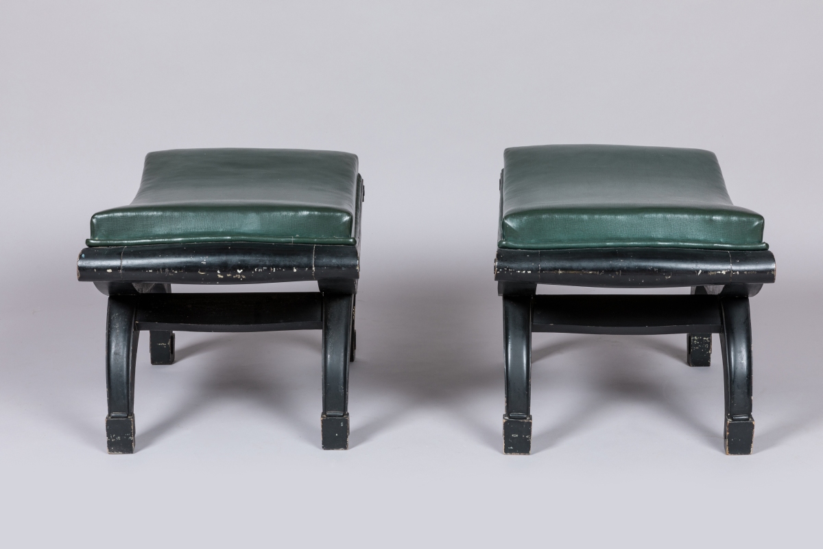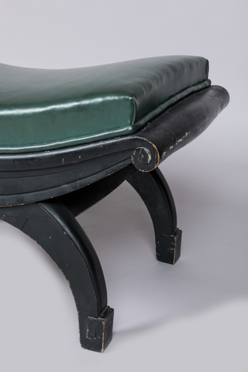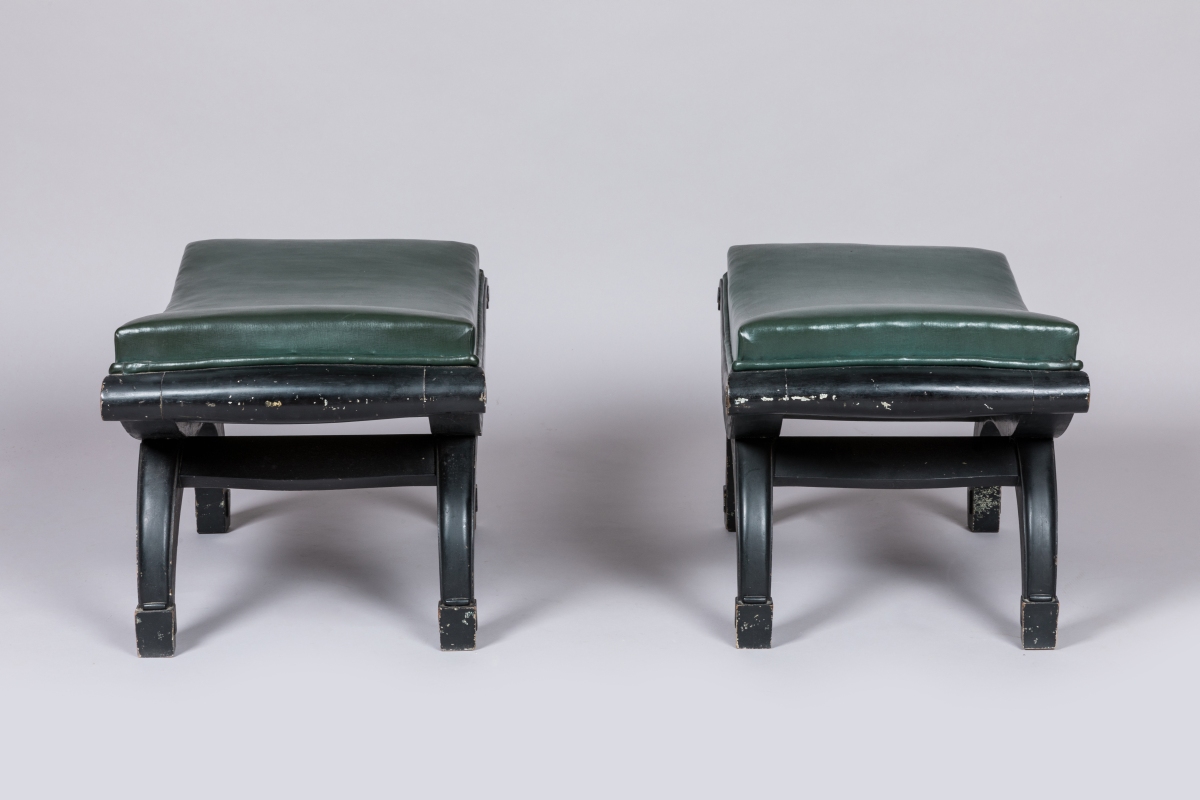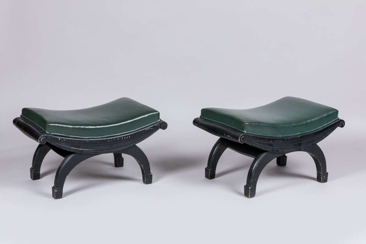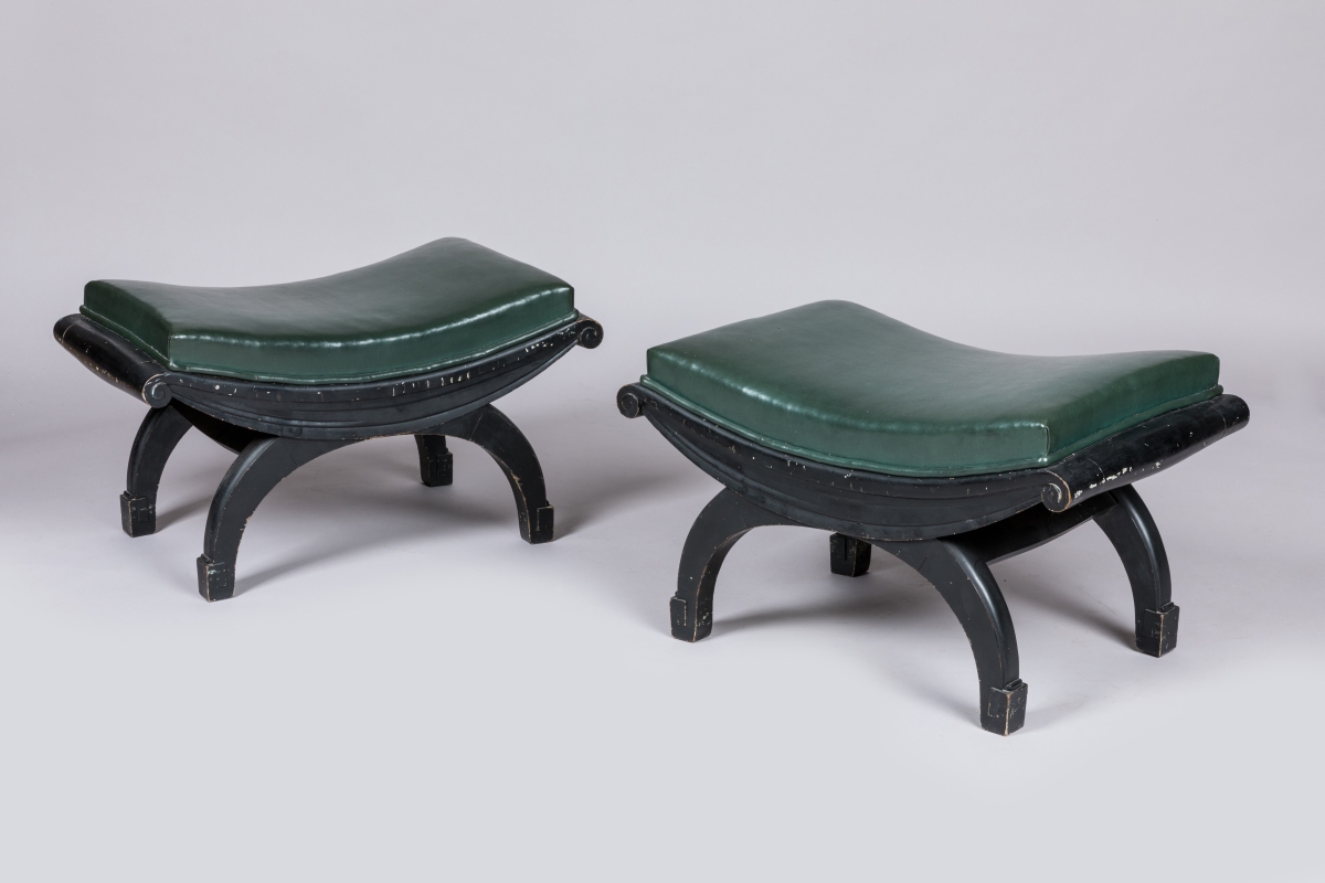 en bois noirci, le piétement en double arcature repose sur une assise à motif plissé plat et de volutes. Garnis de cuir vert.