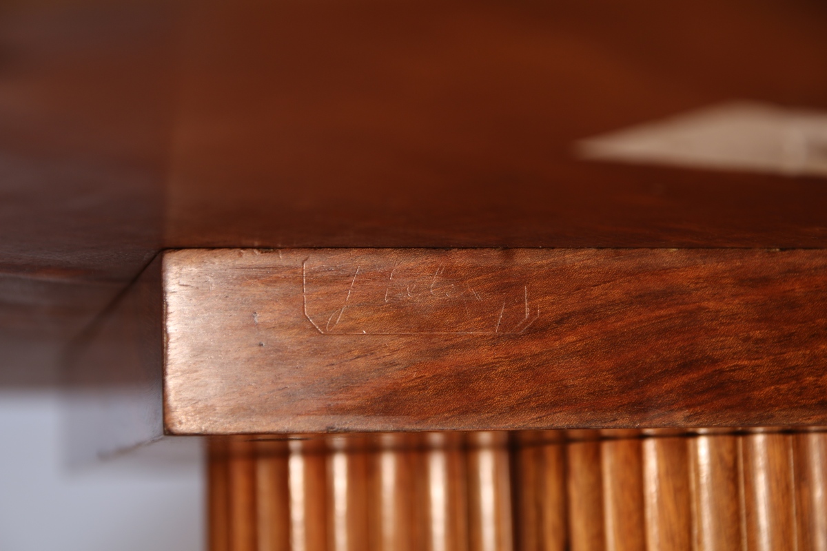 Un guéridon du même modèle, mais de proportions différentes, est reproduit p. 146 de l'ouvrage de Françoise Siriex. Jules Leleu le réalise en 1927 pour l'industriel américain Michaël Winburn. Ce dernier a donné carte blanche à notre ensemblier pour réaménager et meubler son appartement parisien de l'avenue Foch. La réalisation est achevée en 1928 et fait l'objet d'un reportage dans Mobilier et Décoration qui évoque ce "fin guéridon circulaire à fût unique lisse puis cannelé". Cet ensemble exceptionnel a disparu.