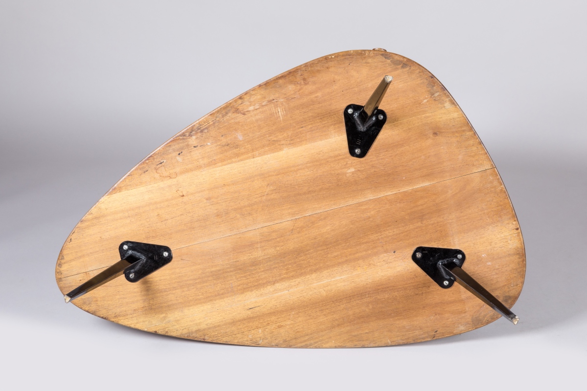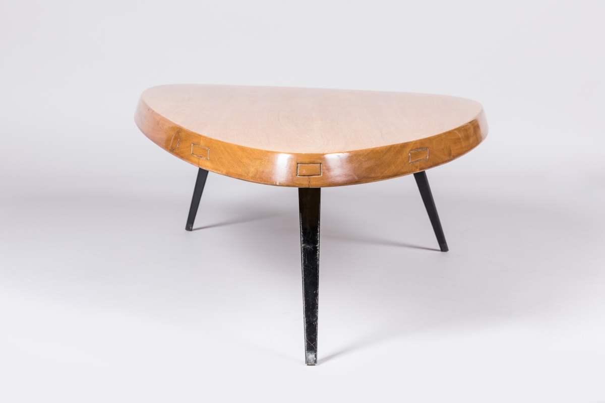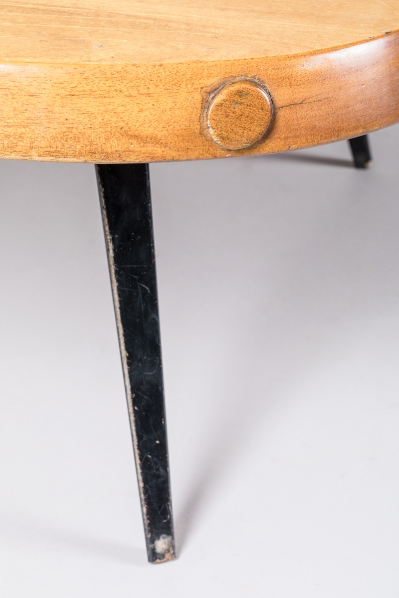 Le plateau en frêne massif, incisé de formes géométriques sur les côtés et orné d'un cabochon, repose sur trois pieds en métal fuselé laqué noir.