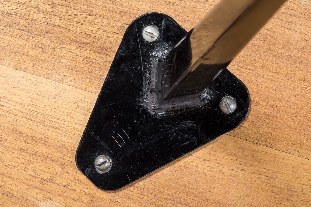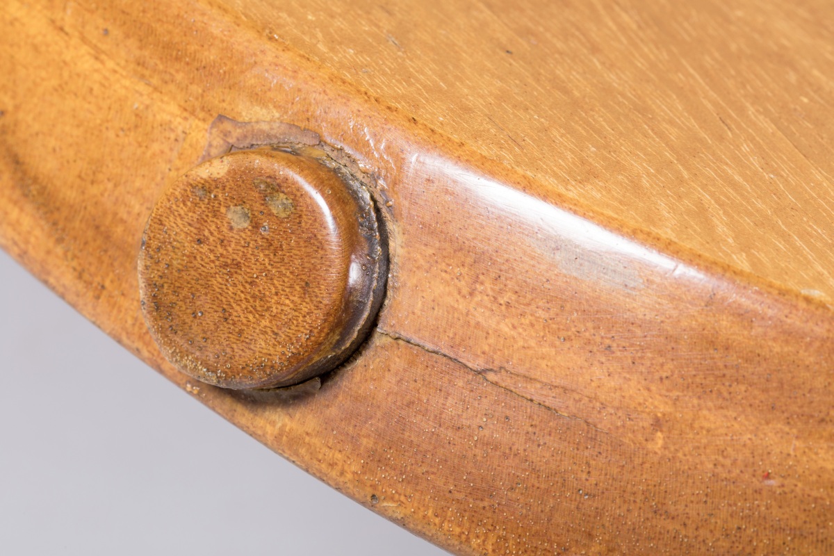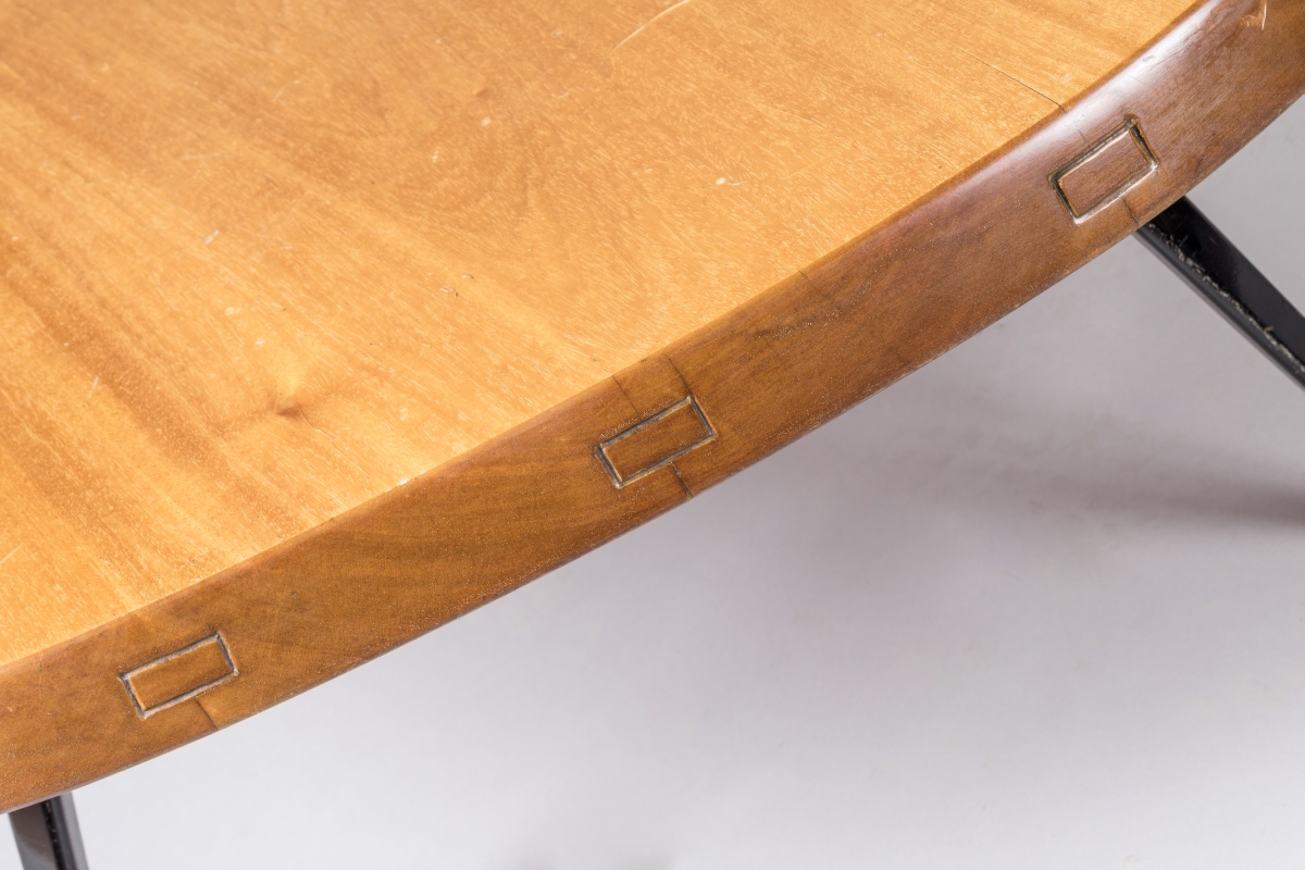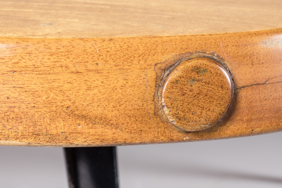 Le plateau en frêne massif, incisé de formes géométriques sur les côtés et orné d'un cabochon, repose sur trois pieds en métal fuselé laqué noir.
