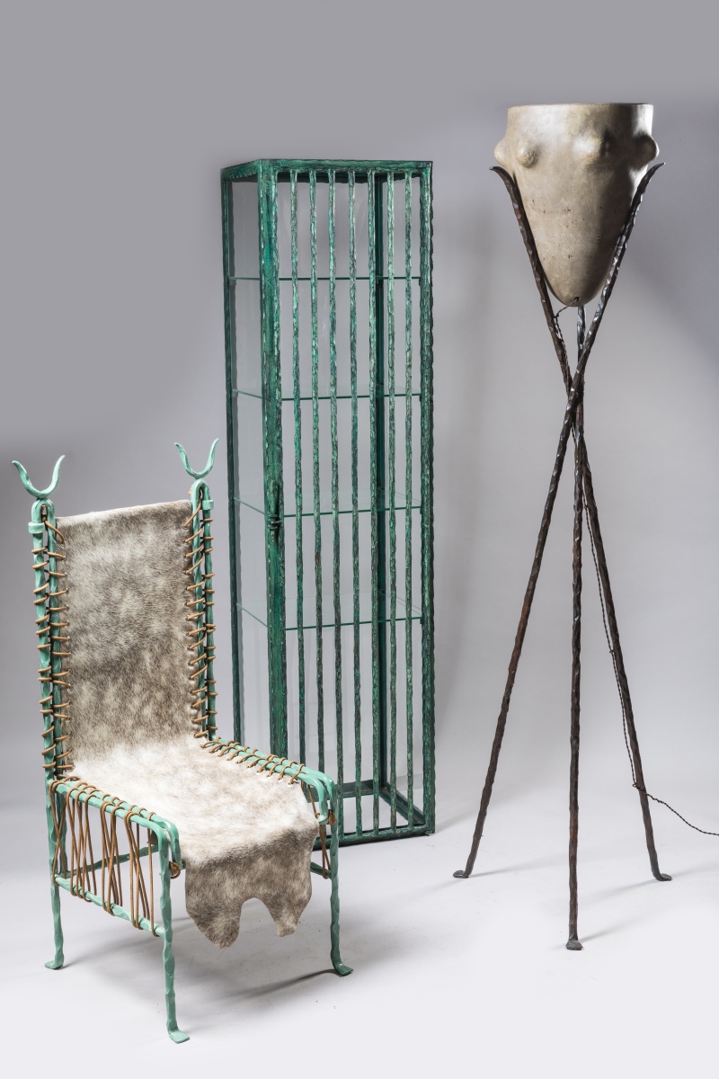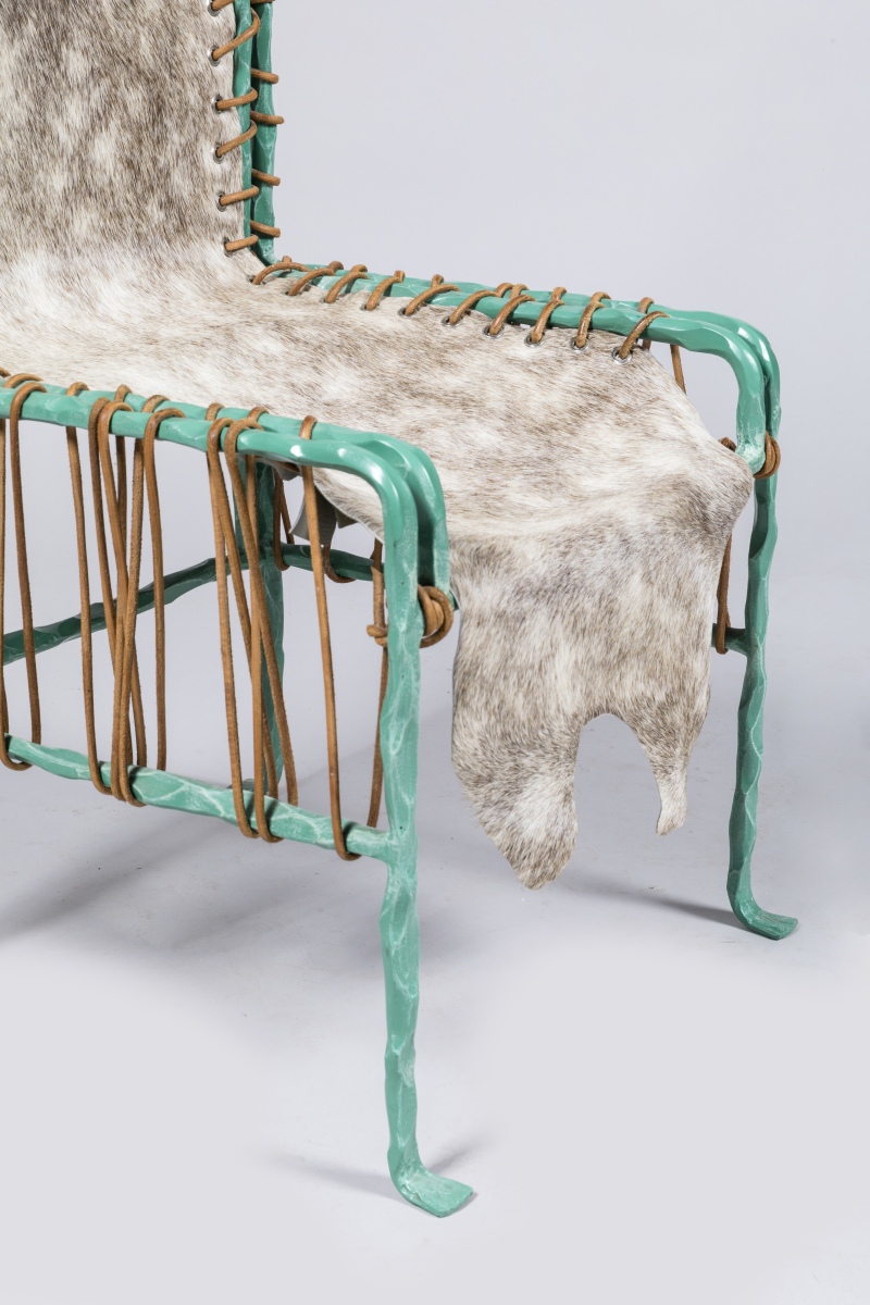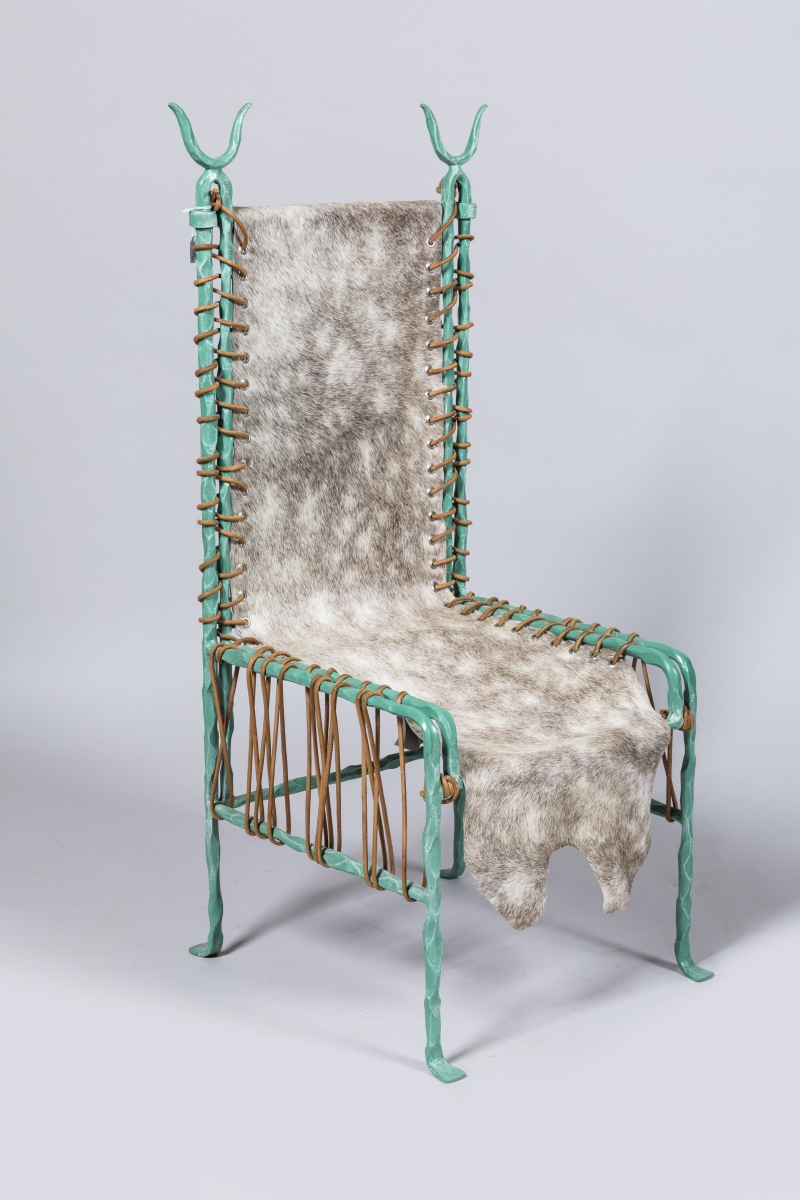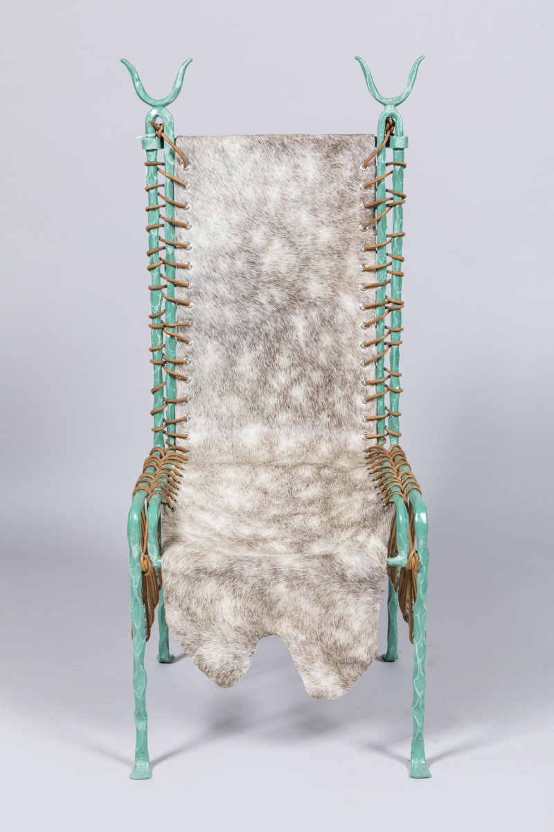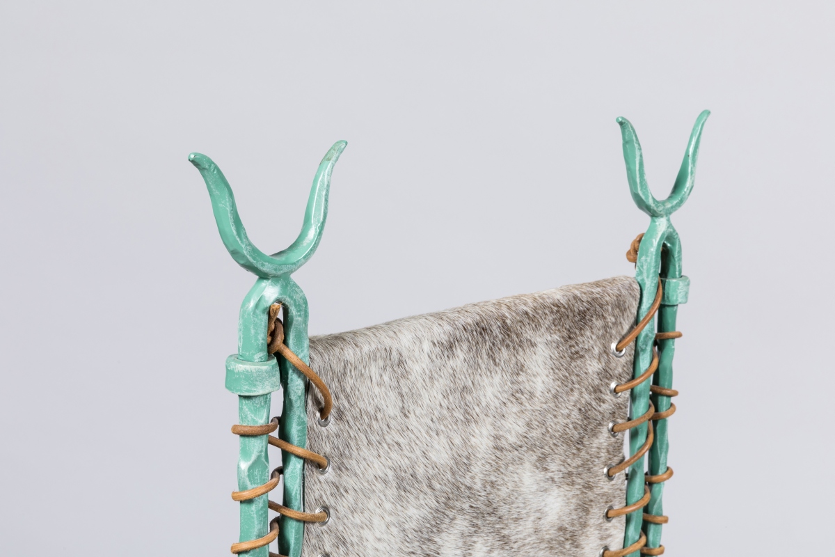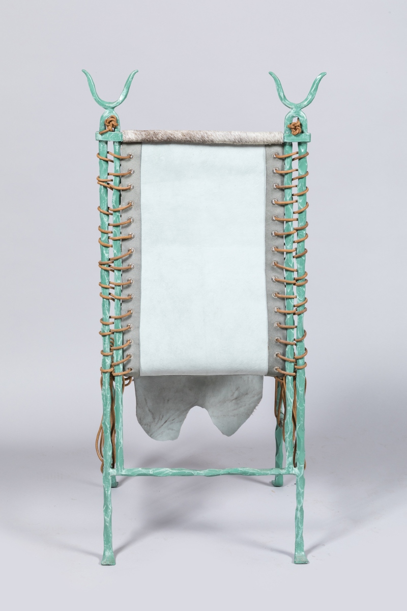 en fer patiné bronze antique et peau de vache ou de poulain maintenue par un lacet en cuir.