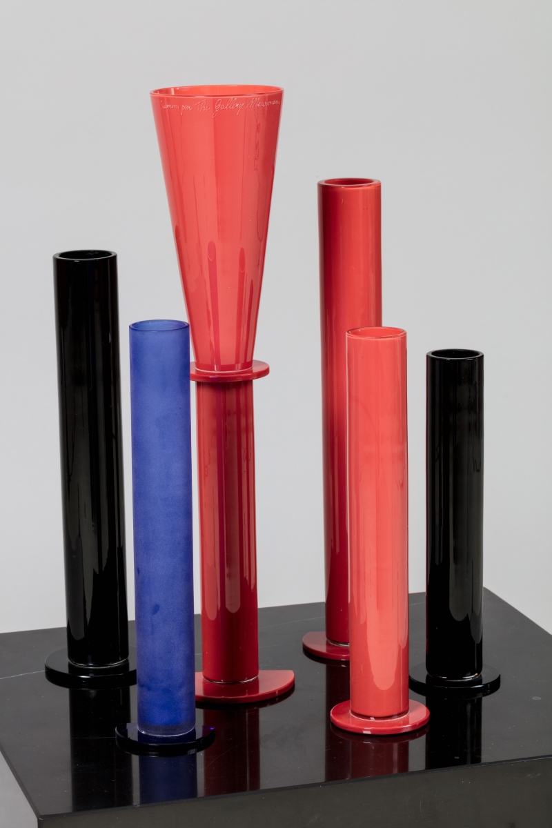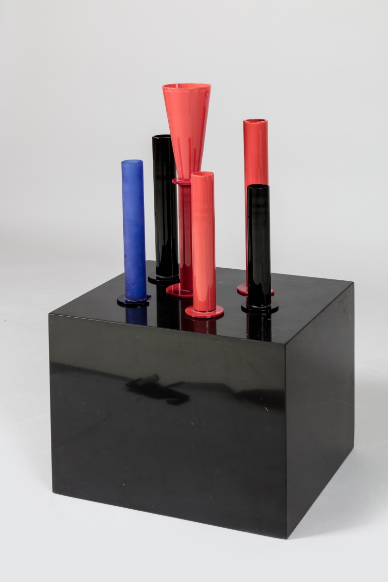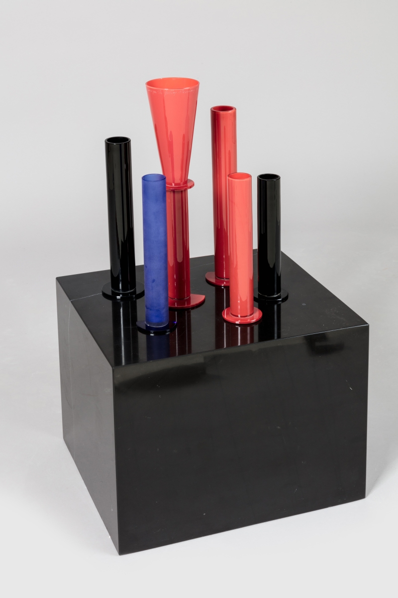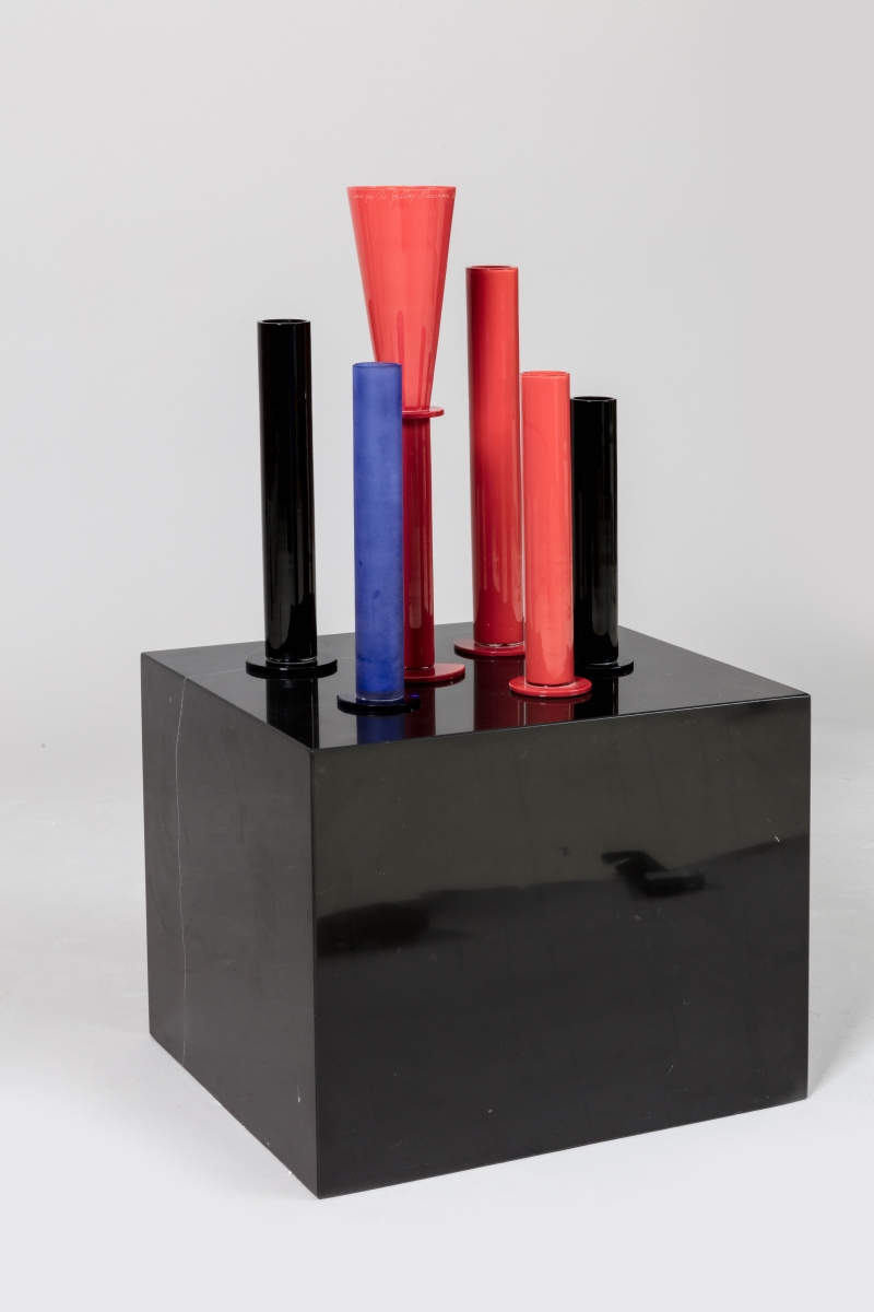 Socle cubique en marbre noir avec six vases tubulaires en verre de Murano, trois rouges, un bleu et deux noirs. Signature manuscrite gravée au premier plan sur l'un des éléments en verre "Venini by The Gallery Mourmans 5/5" et daté.