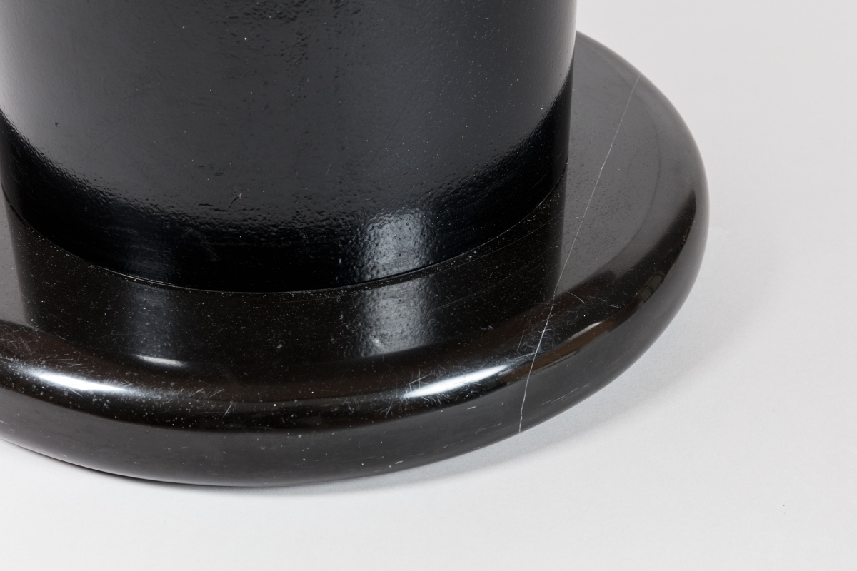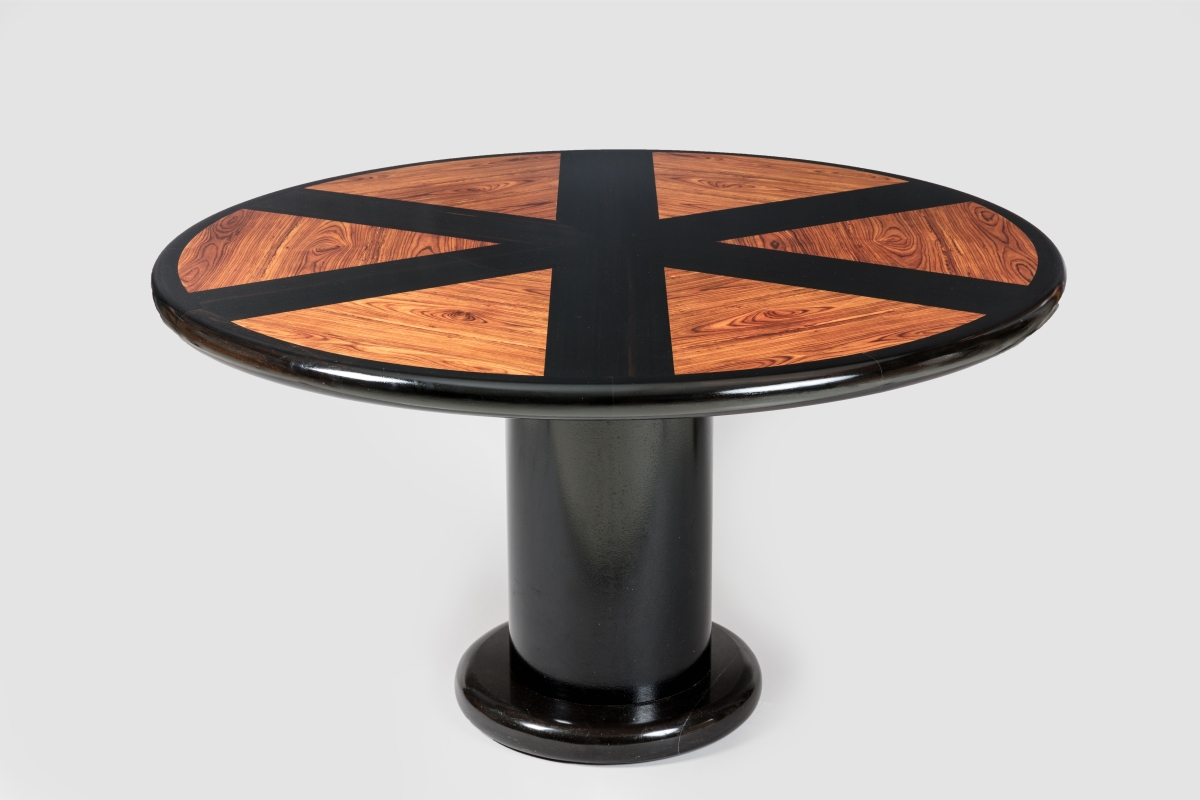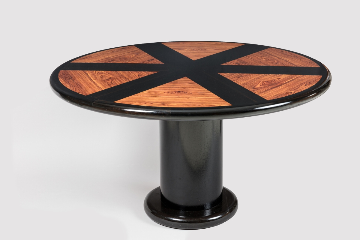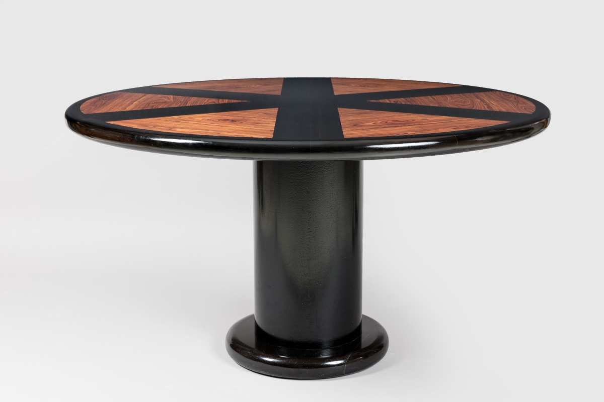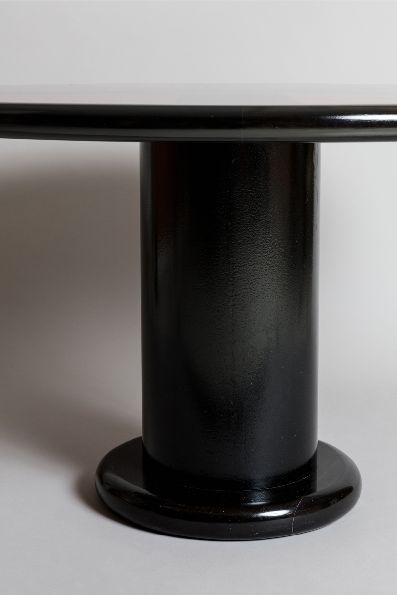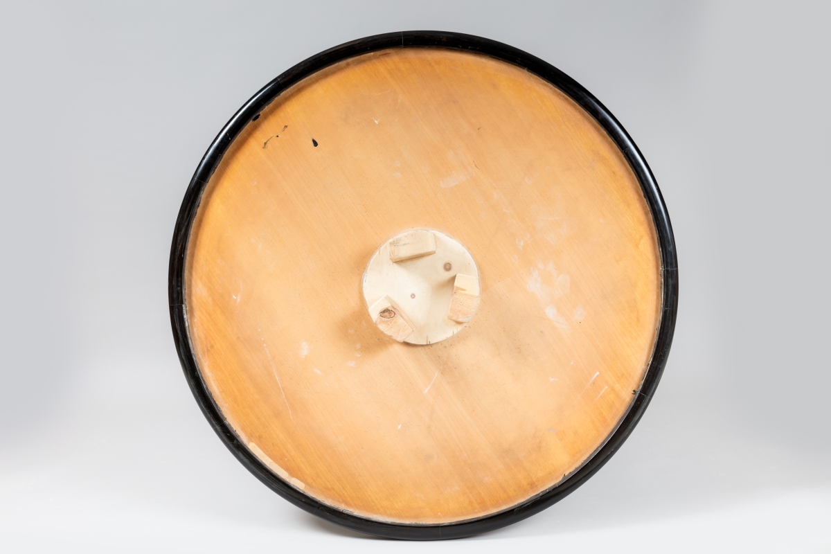 plateau circulaire décoré d'ébène de Ceylan et de bois de violette, soutenu par une base centrale en métal laqué noir reposant sur un socle en marbre noir débordant.