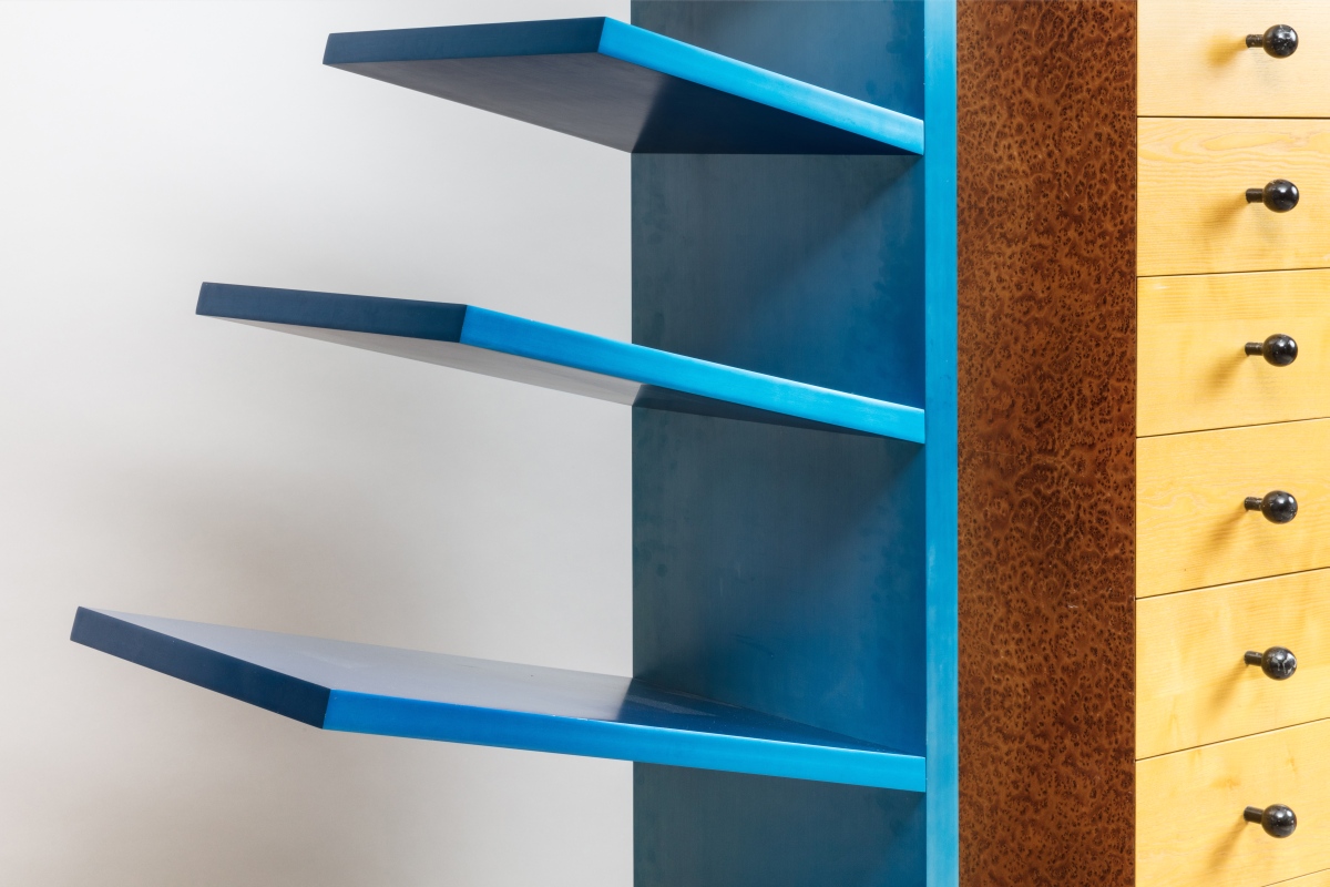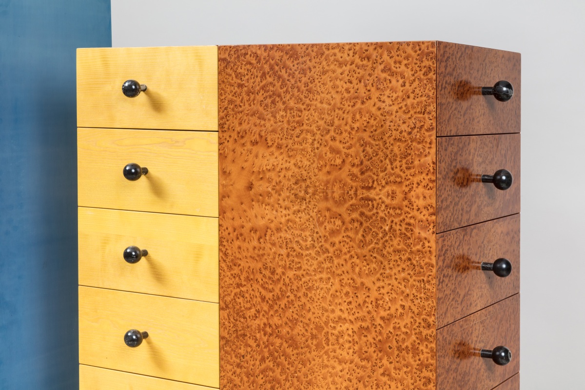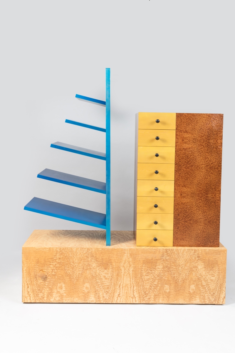 Base haute en placage de loupe de cèdre abritant une épaisse plaque d'aluminium anodisé sur laquelle sont fixées cinq étagères en porte-à-faux. Une colonne de stockage indépendante en placage de frêne teinté jaune et en frêne japonais ouvre sur deux rangées de huit tiroirs.