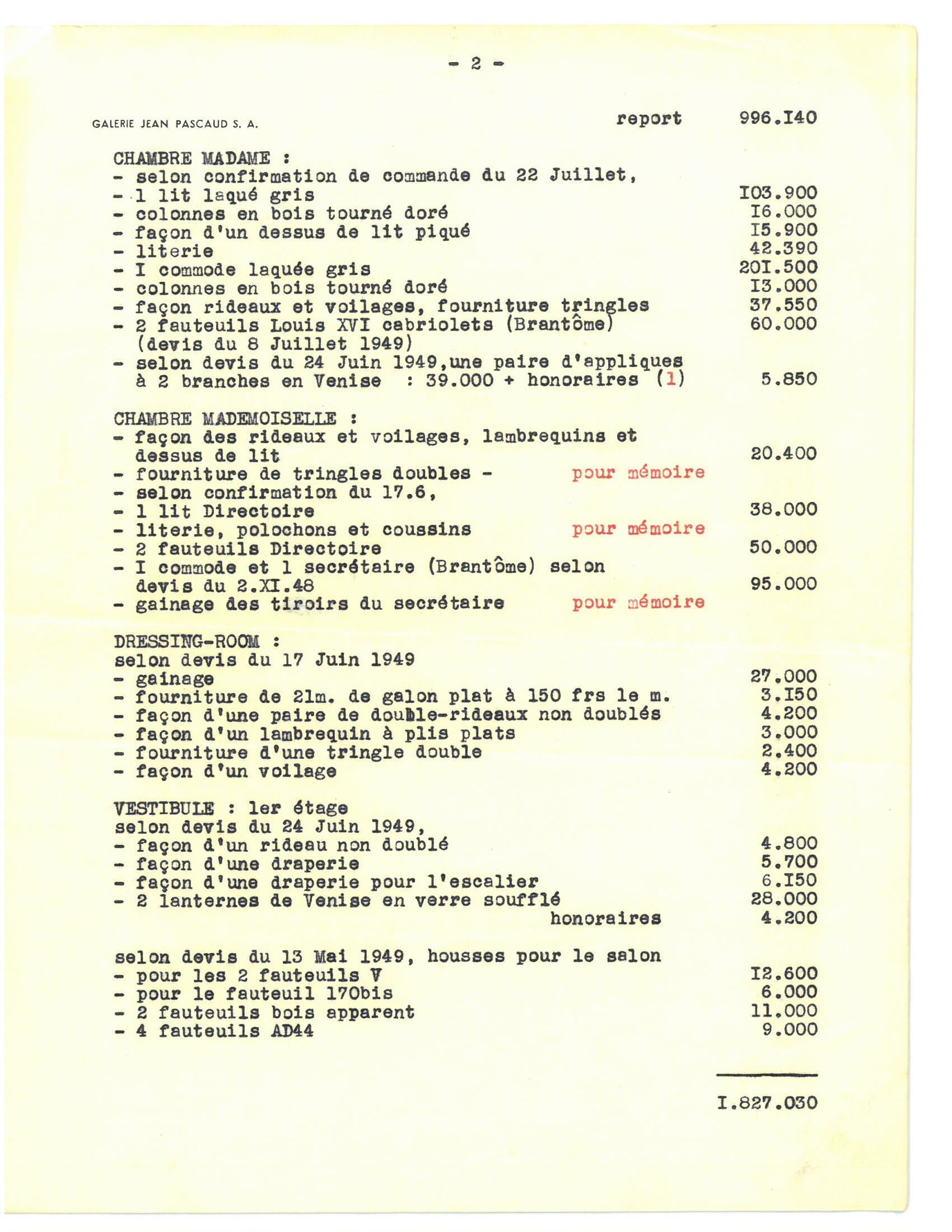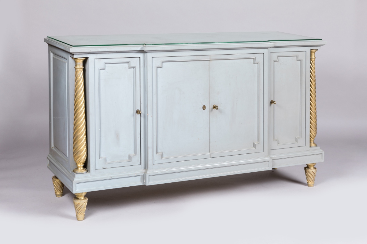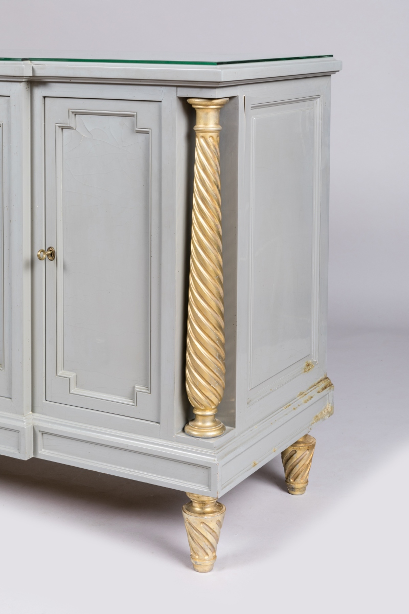 Provenance: chambre de Madame de la villa Tiffonet à Châtres-sur-Cher ; acquise auprès de la Galerie Jean Pascaud SA, 14 septembre 1949, sous la description "I commode laquée gris Frs 201.500" / "colonnes en bois tourné doré Frs 13.000" ; par descendance.
