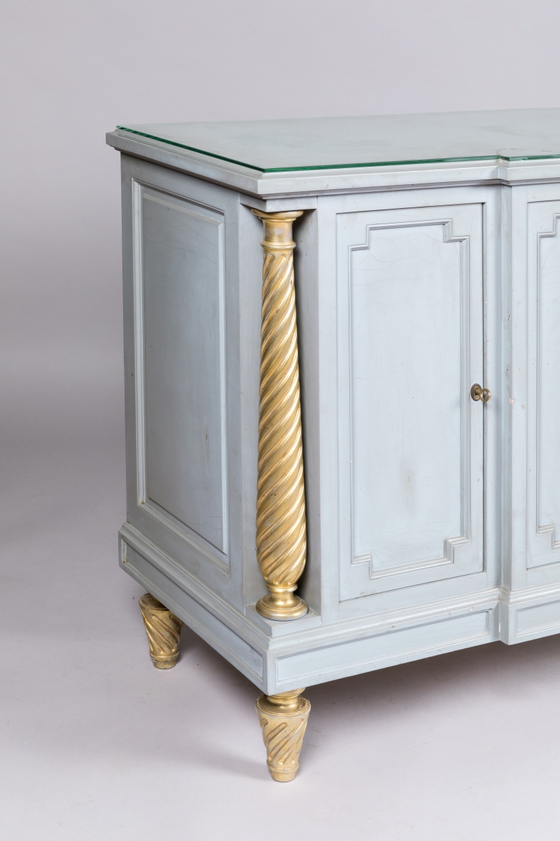 en bois mouluré et sculpté laqué gris bleuté et doré. La façade à décrochement ouvre par deux vantaux et deux portes. Montants détachés en balustre à décor de cannelures torses. Elle repose sur quatre pieds fuselés et cannelés. Plateau de verre (accidenté).