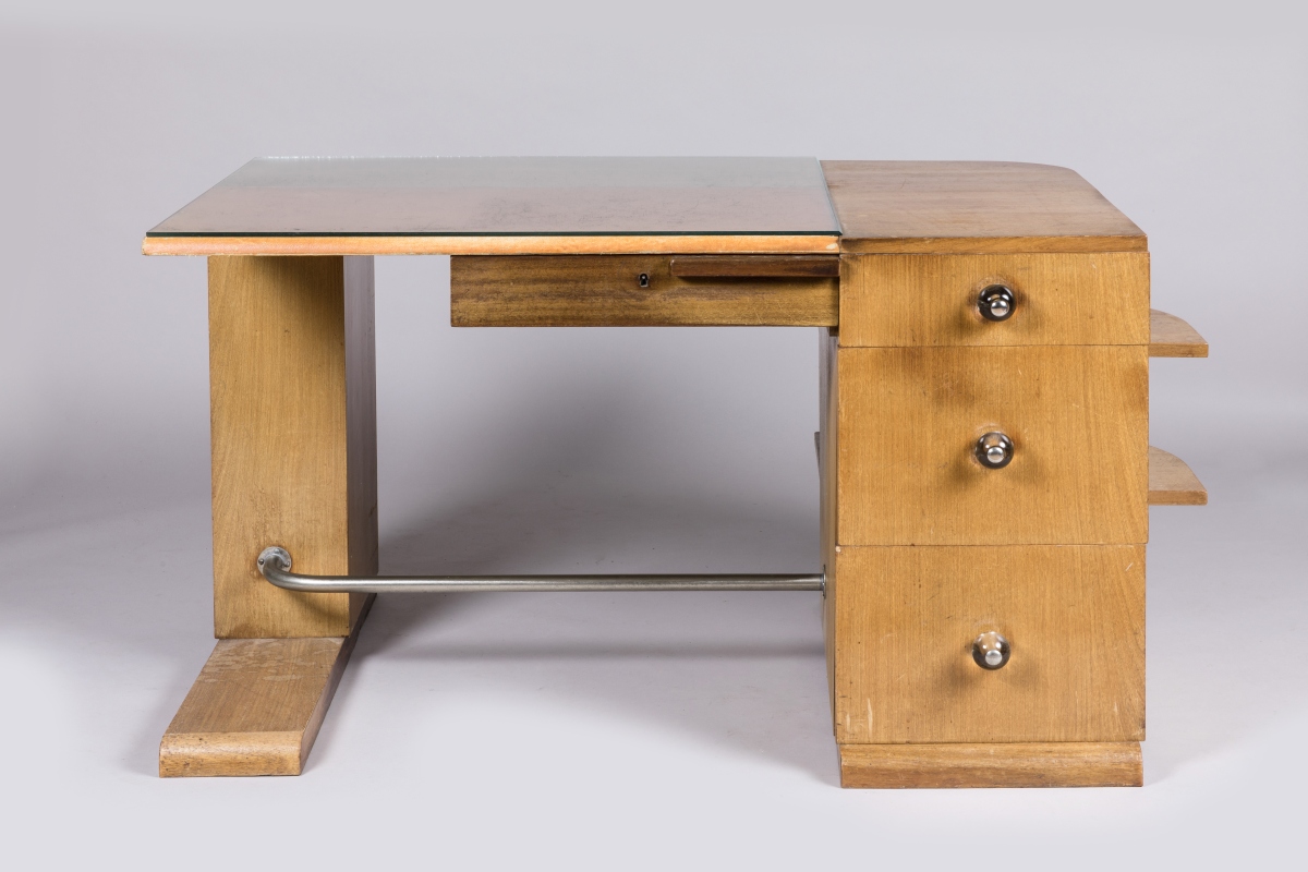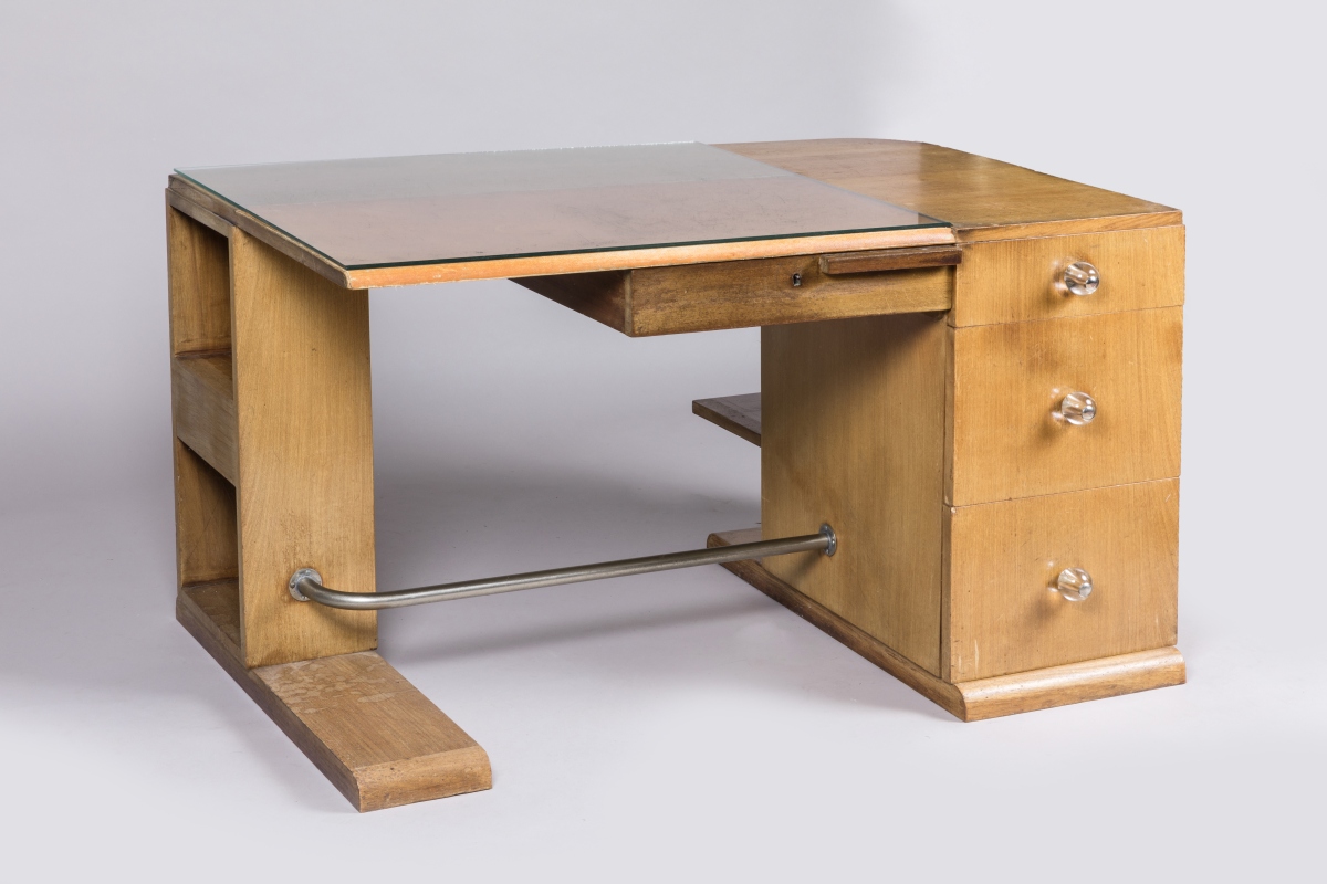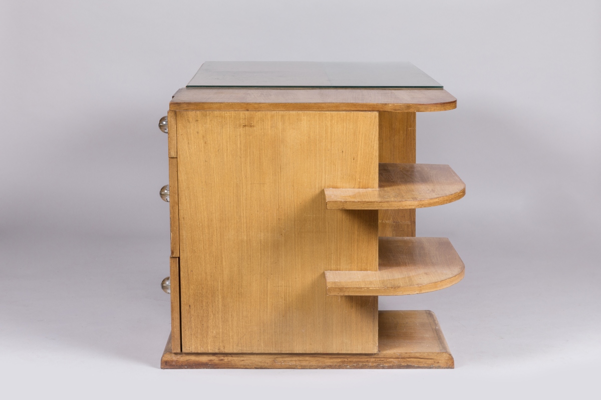en placage de bois clair. Du côté droit, il est muni d'un caisson présentant trois tiroirs à poignées de verre enrichis de deux étagères. Du côté gauche, un montant accueille deux niches. Il ouvre par un tiroir en ceinture. Le plateau en partie foncé d'une toile enduite. Repose-pieds constitué d'une barre tubulaire. Pieds patins.