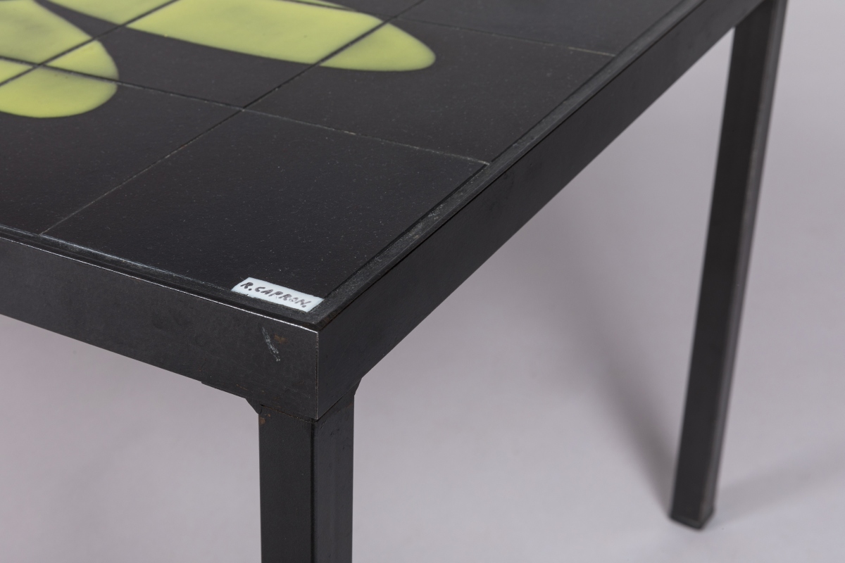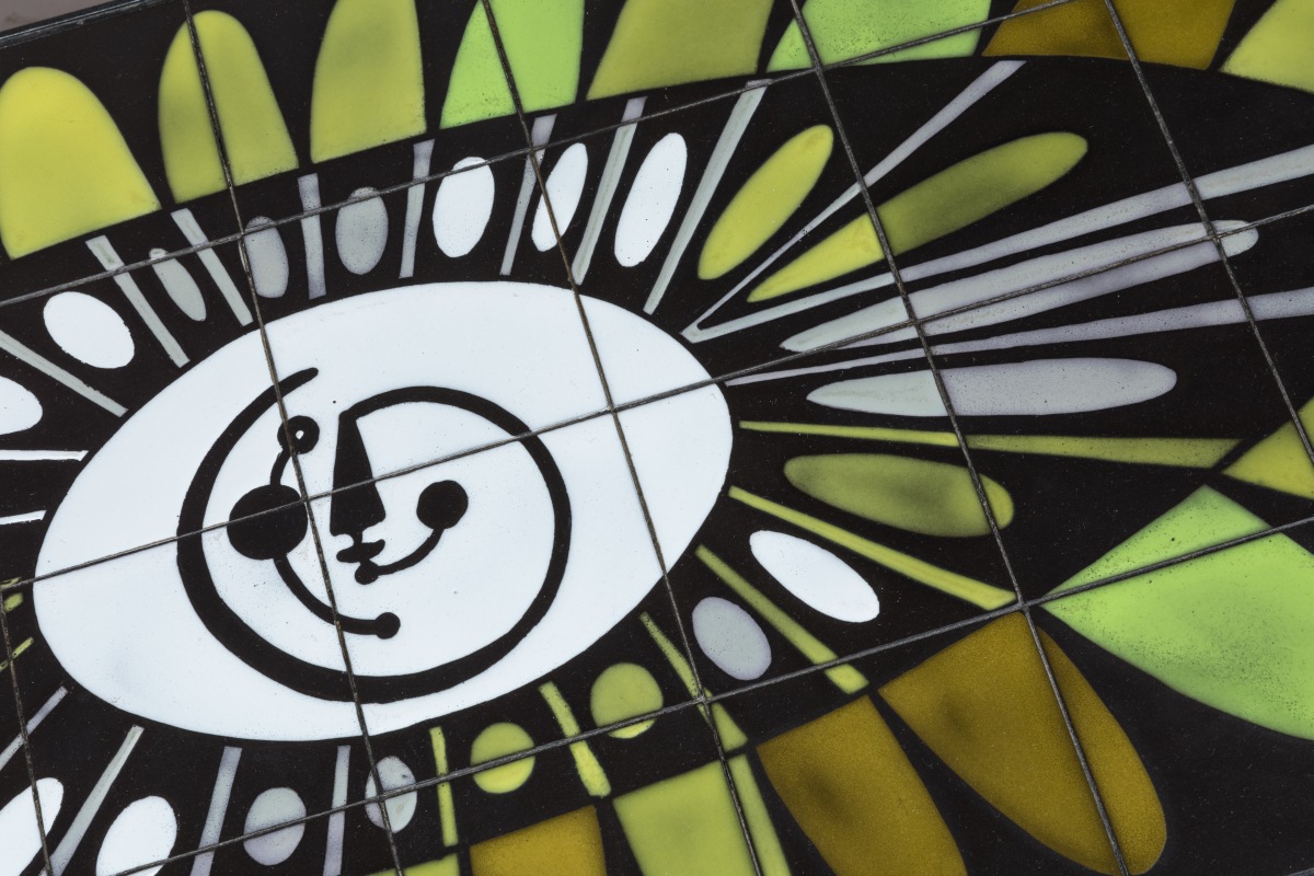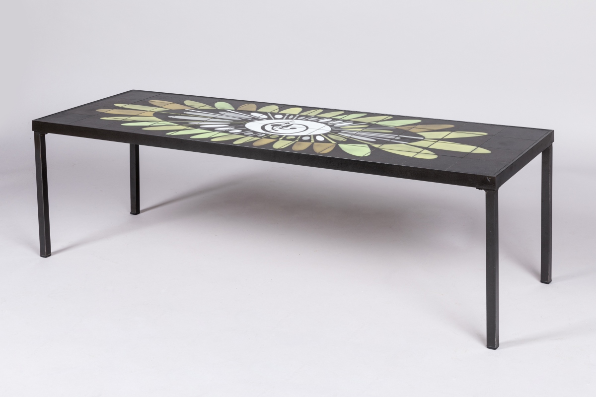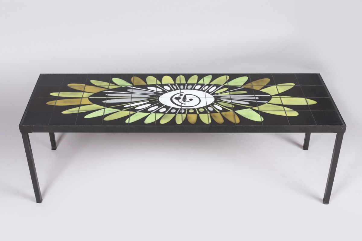 en métal laqué noir, recouverte de quarante-huit carreaux de céramique. Décor de pétales de fleur épanouie sur fond noir, au coeur stylisé.