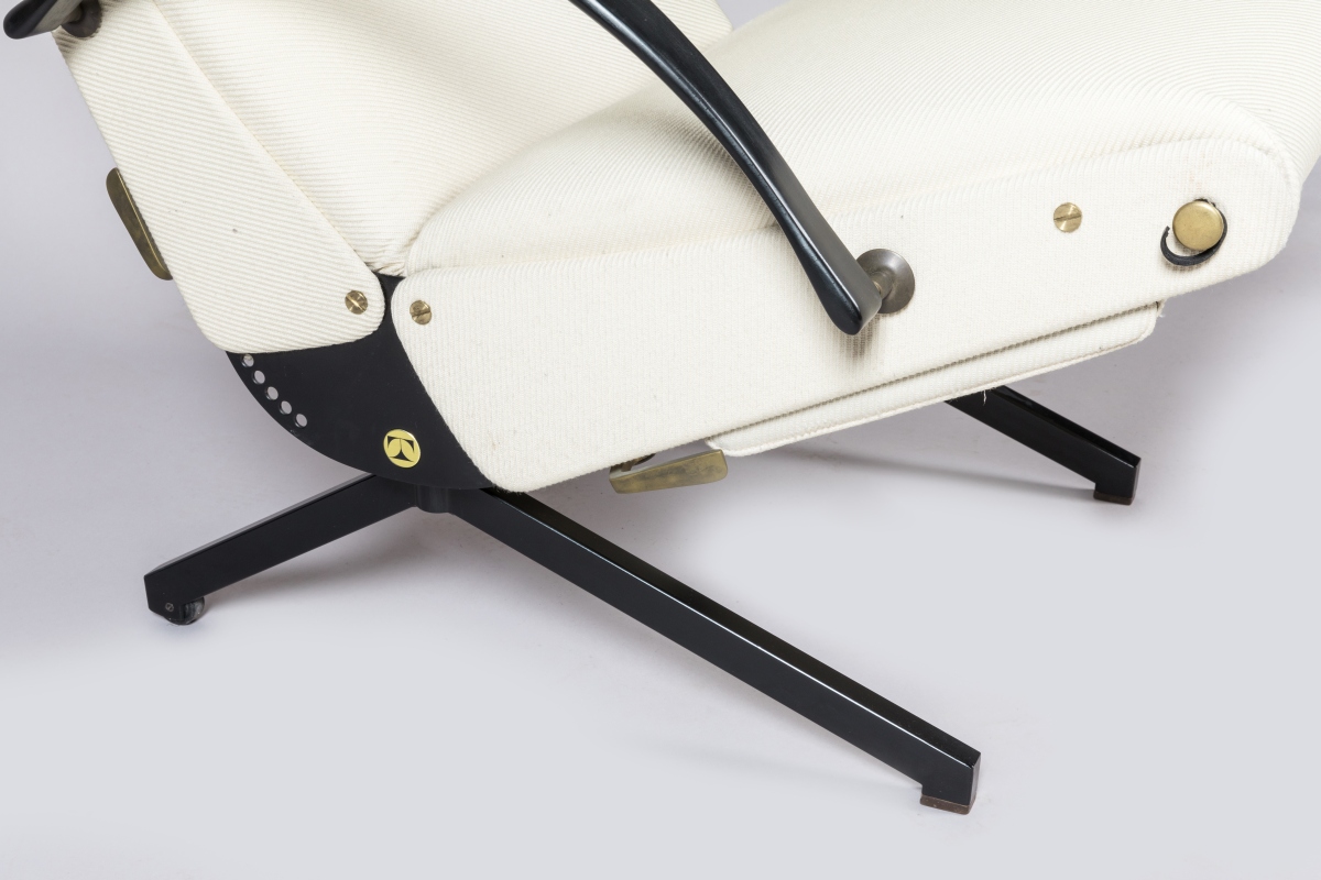 en métal tubulaire laqué noir, mousse garnie de drap de laine beige. Accotoirs flexibles en plastique noir. Plaque de l'éditeur Tecno sur les côtés.