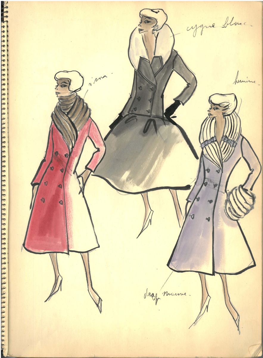 Vingt-cinq feuilles en couleurs comprenant chacune de trois à six dessins dont des croquis de face et de dos: manteaux de fourrure en vison, hermine, renard noir, ragondin et breitwantz ; tailleurs en satin, robes de soirée et de cocktail. Les tenues sont pour certaines accompagnées d’un accessoire tel que manchon en fourrure ou écharpe. De nombreuses annotations manuscrites au crayon de papier précisent les matières à utiliser lors de la mise en couture.