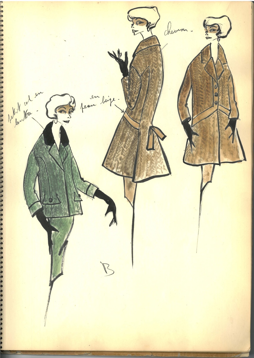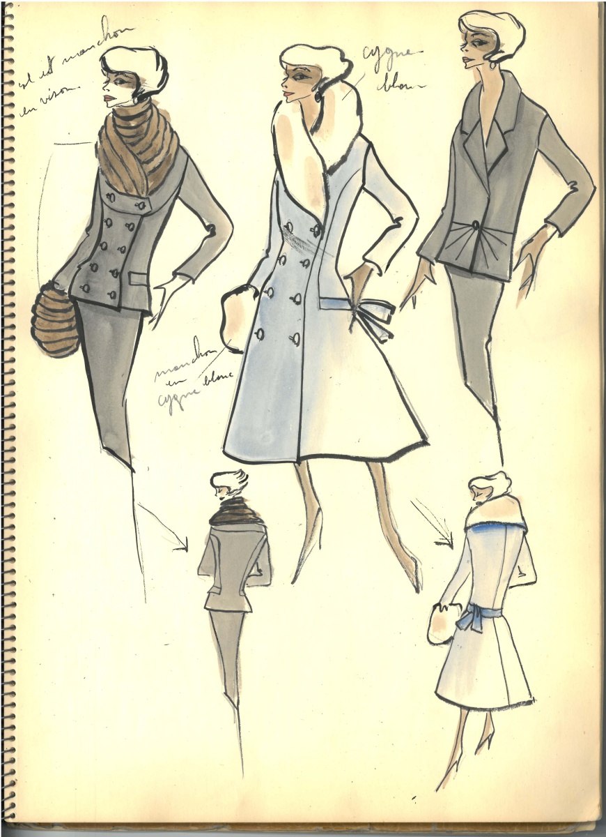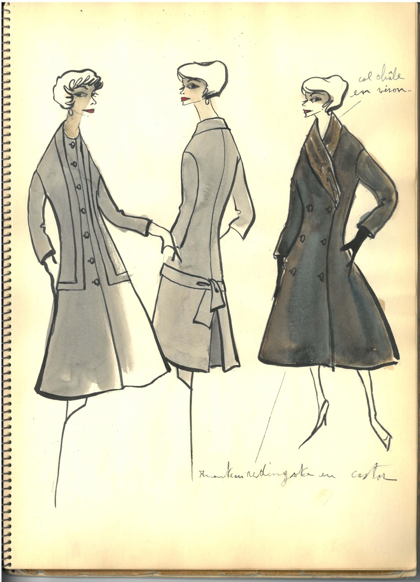 Si le jeune dessinateur italien René Gruau illustre les créations de Balenciaga, Rochas ou Givenchy dès son arrivé à Paris dans les années 1930, nos carnets sont à rapprocher de dessins réalisés pour Christian Dior (Ader, n°419 et 420, 18 novembre 2016) et Jacques Fath. Nos dessins rappellent en effet les premières collections d’Yves Saint Laurent chez Dior, avec sa célèbre ligne Trapèze en 1958, dont on retrouve la ligne d’épaule et l’encolure dégagée. De nombreuses maisons, comme celle de Jacques Heim, s’inspirent également de cette ligne, ainsi qu'en témoigne un carnet conservé au musée Galliera (2013.0.5).