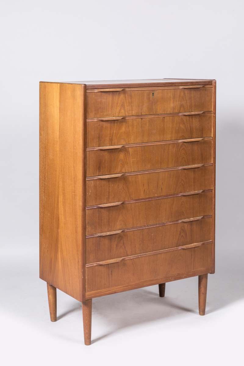en teck reposant sur quatre pieds fuseaux. Un des tiroirs fermant à clé.