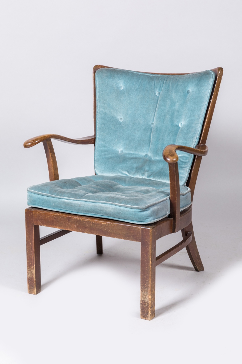 en bois naturel au dossier enveloppant, à l'assise légèrement bombée, les accotoirs en consoles reposant sur des montants droits, les pieds antérieurs droits et postérieurs en sabre.