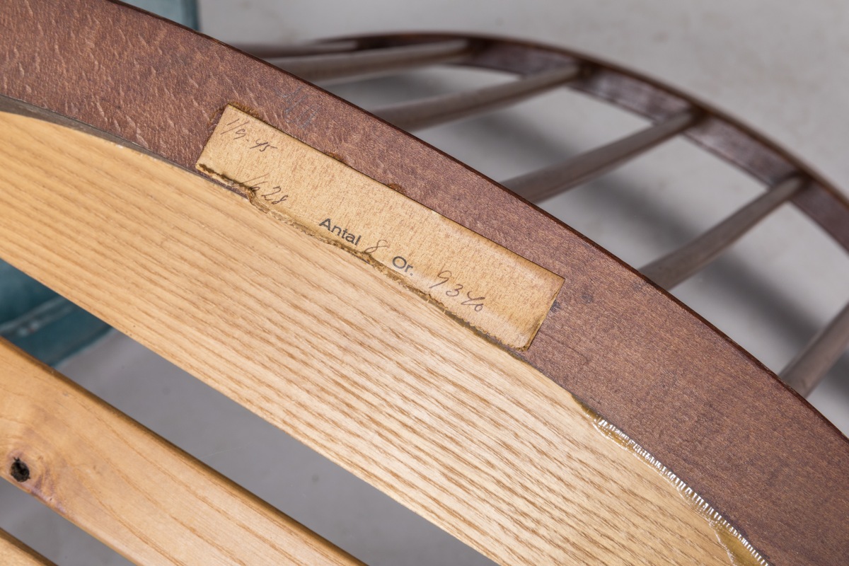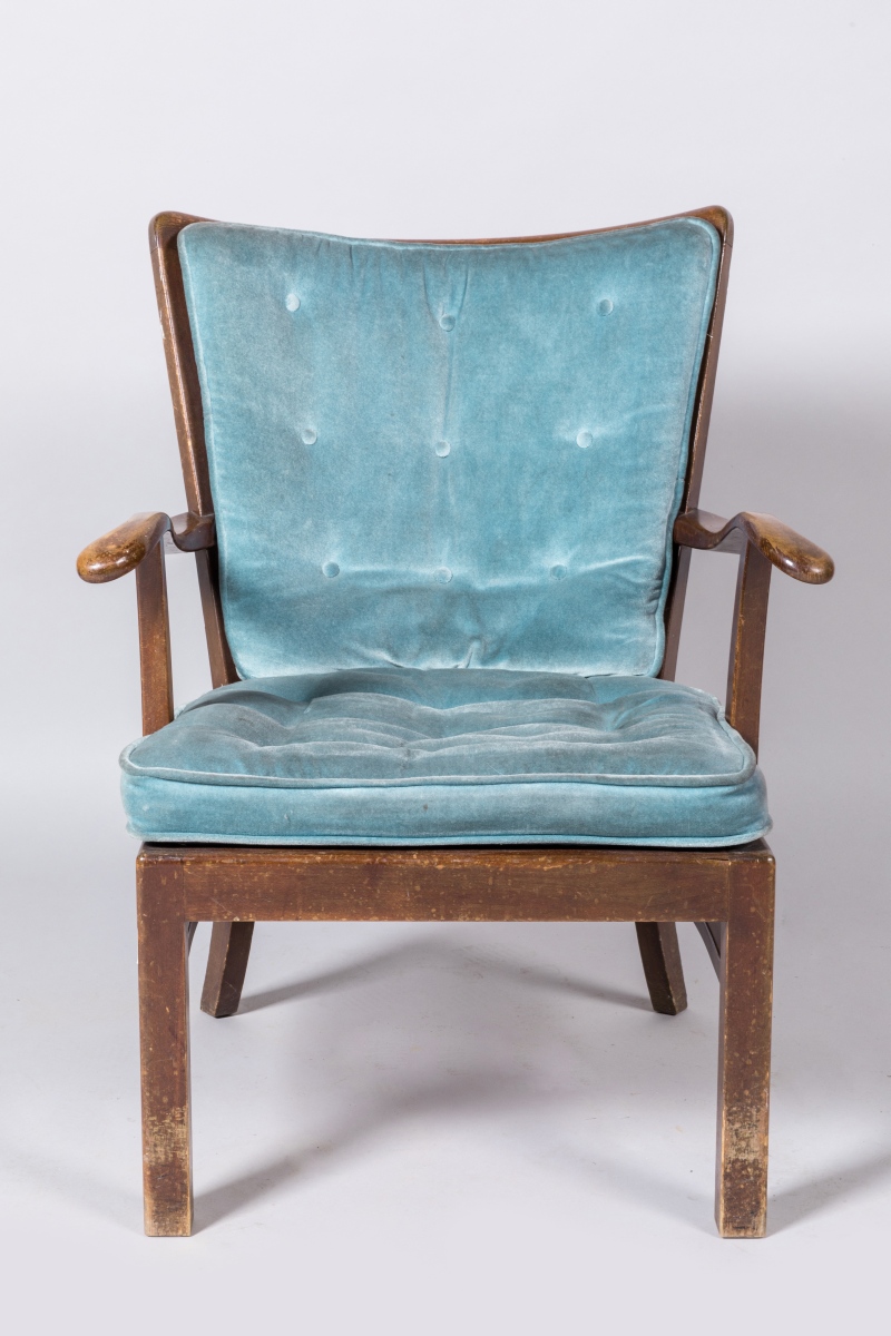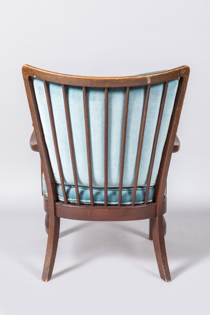 Garniture en velours bleu. Étiquette manuscrite du fabricant sur le châssis.