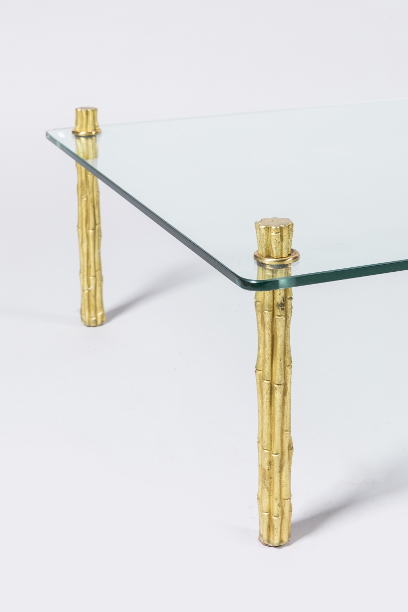 le plateau en verre reposant sur quatre pieds façon fagots de bambous en métal doré.