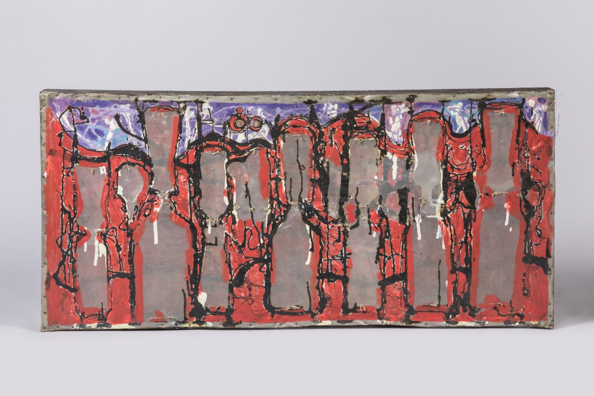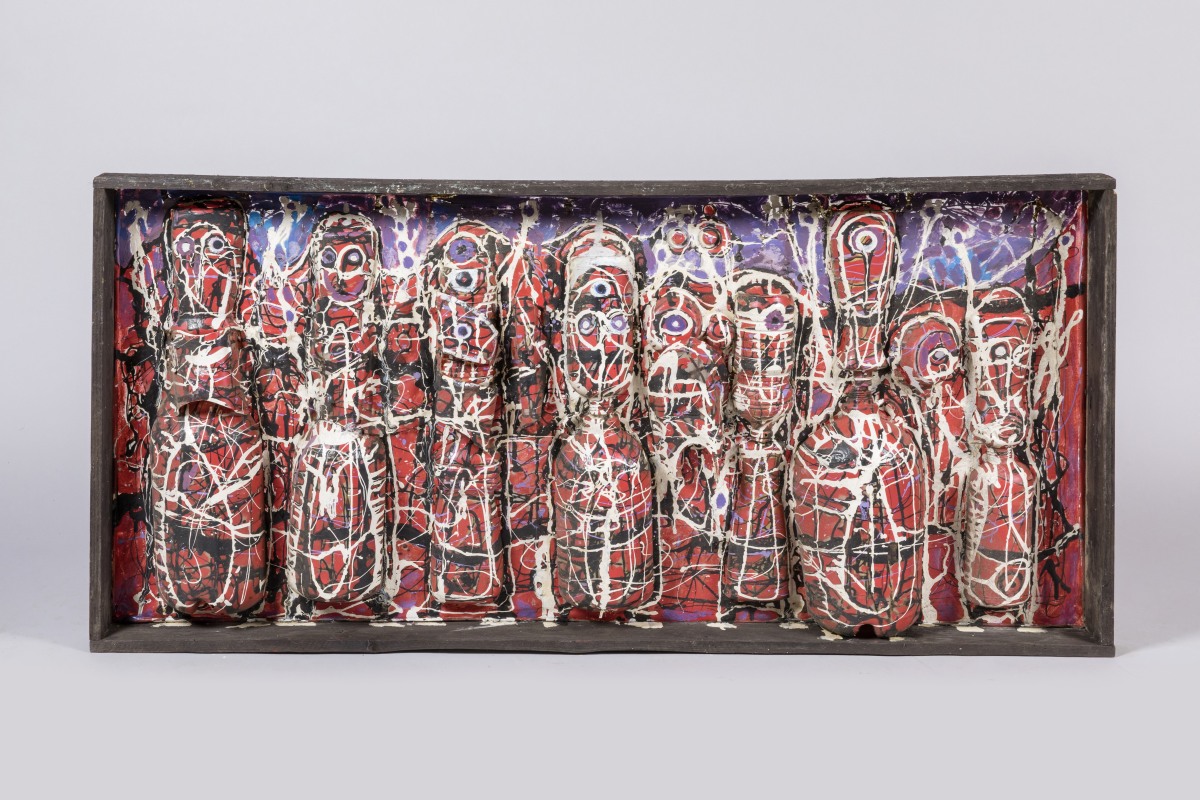 en bouteilles plastiques peintes sur bâche, dans un cadre de bois.