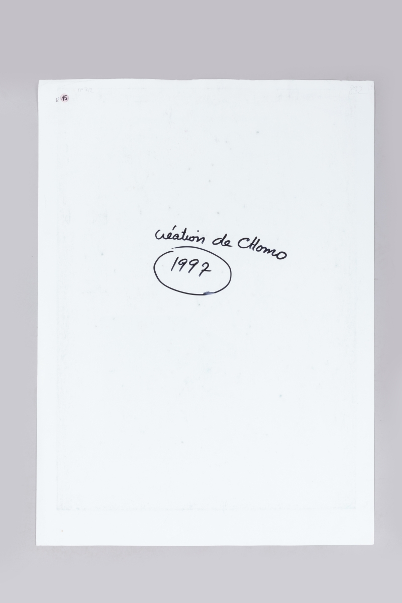 Encrine signée. Contresignée et titrée sur le montage. Datée 1997 et marquée "création de Chomo" au dos.