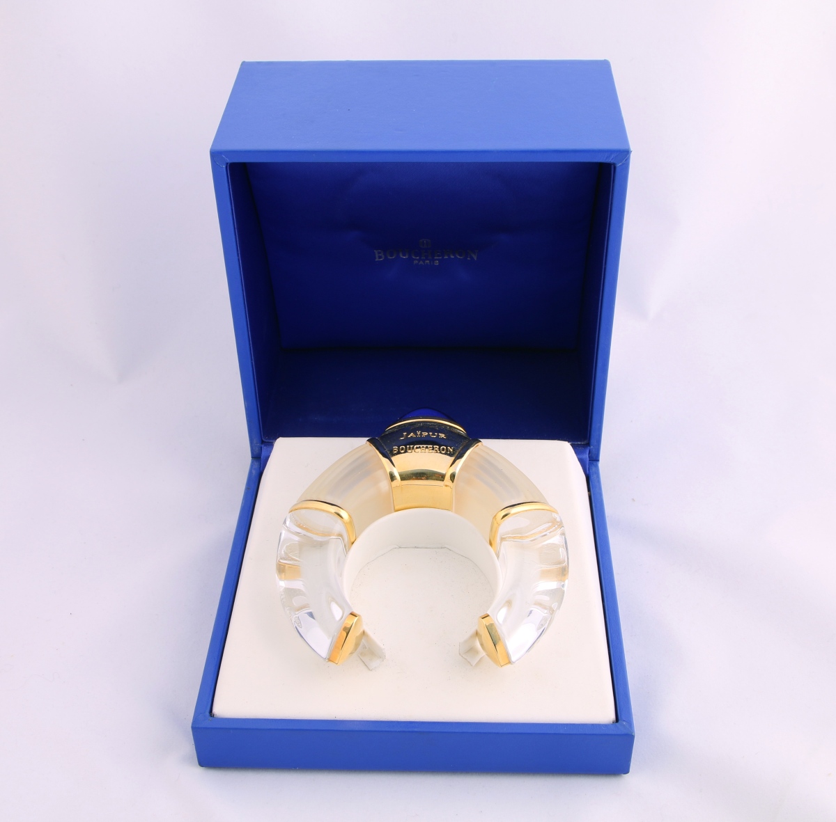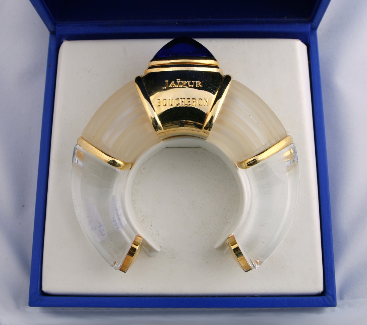 Présenté dans son coffret carré façon joaillier siglé et titré, flacon en verre incolore pressé moulé, zamac, et résine figurant un bracelet, son bouchon figurant un saphir cabochon imitation.