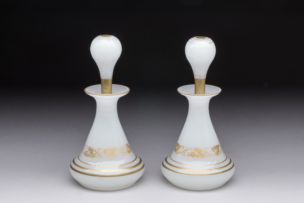Deux flacons en verre opalin blanc rehaussé à l'or de section cylindrique, leur panse conique tronquée à décor de feuillages et de rainures, col à carnette saillante, leur bouchon cabochon à tige rehaussé à l'or. titrés sous leur assise.
