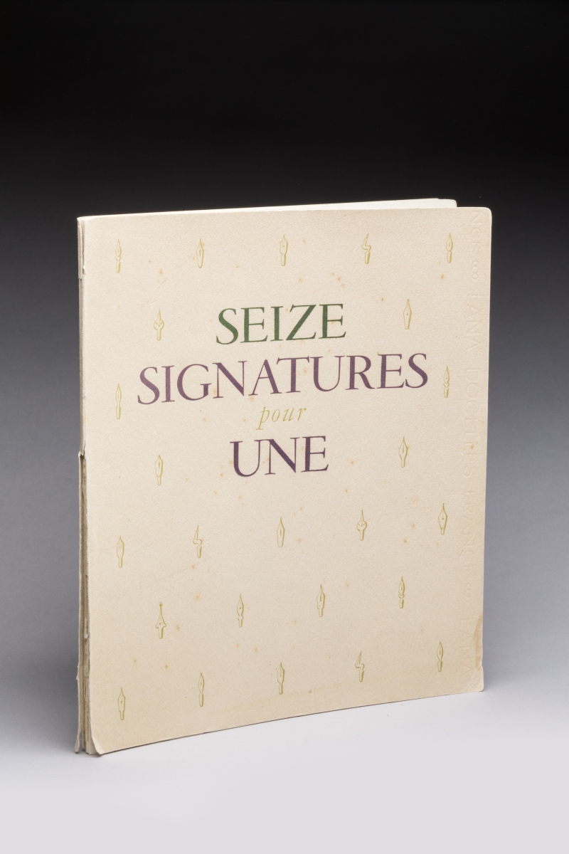 Joint: la plaquette de lancement de ce parfum titrée "Seize Signatures pour Une" éditée par AlJanVic en 1946 contenant des textes et illustrations de célébrités des Arts et des Lettres de l'après-guerre.
