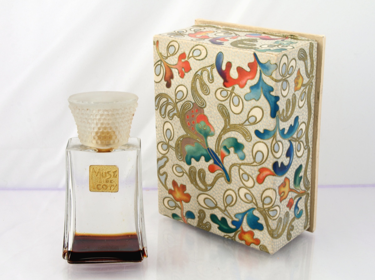 Présenté dans son coffret luxe rectangulaire en carton gainé de papier gaufré polychrome à décor floral et végétal, intérieur satin, titré, flacon en verre incolore pressé moulé de section rectangulaire, panse trapézoïdale, avec son bouchon cranté coiffé de sa capsule cylindre ovale en verre dépoli décoré de picots, étiquette or gaufrée sur une face. (PdO)