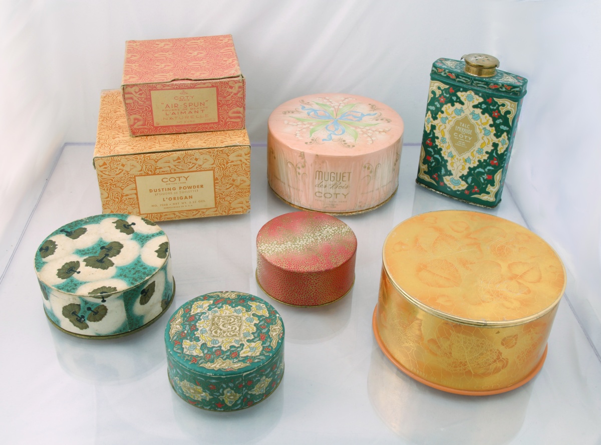 Lot comprenant un flacon de talc parfumé "Émeraude" en métal chromolithographié , trois boites de poudre "Air Spun", une boite de poudre parfumée "Muguet", et une boite de poudre parfumée "L'Origan", de section cylindrique forme tambour en carton gainé de papier polychrome titré illustré.