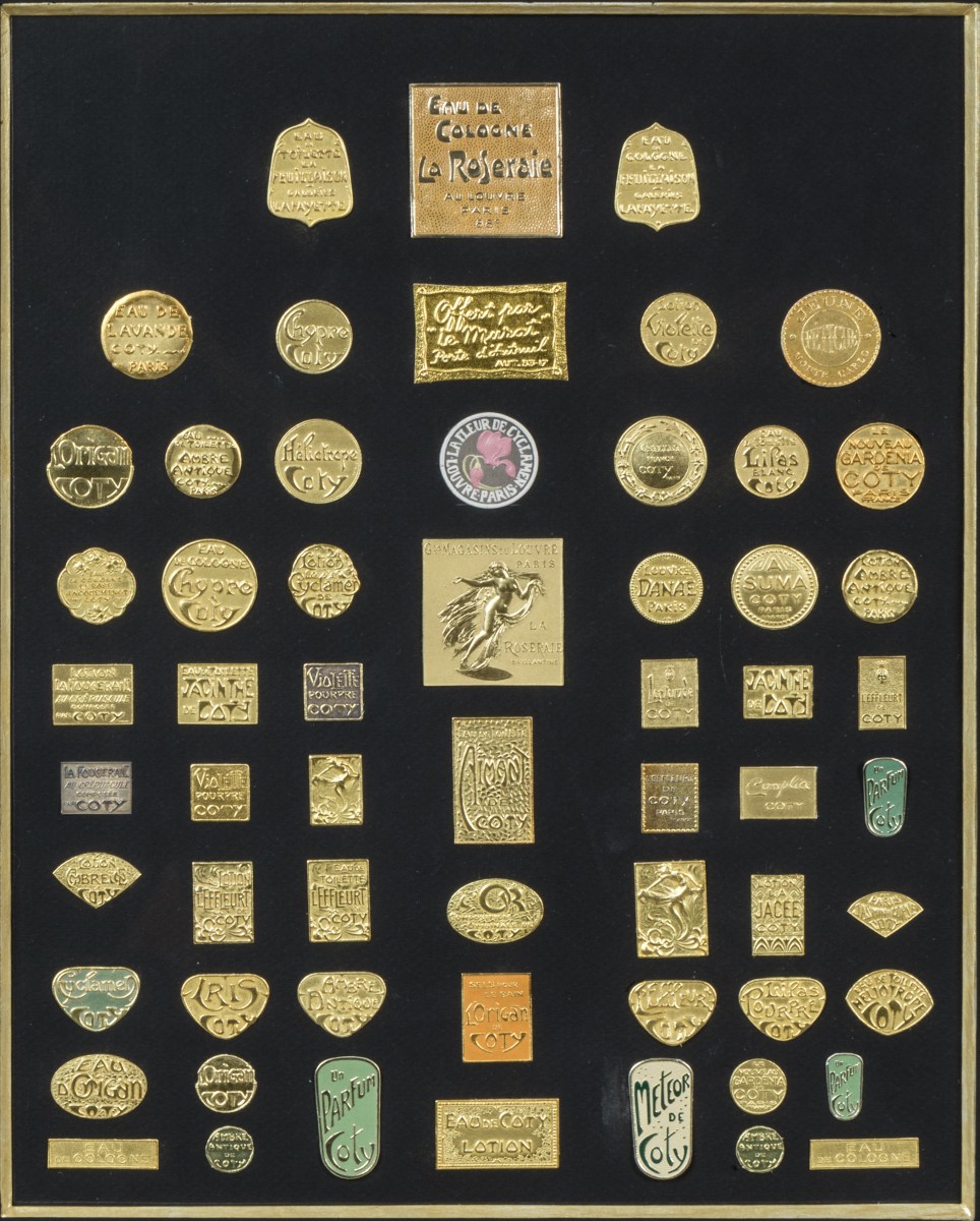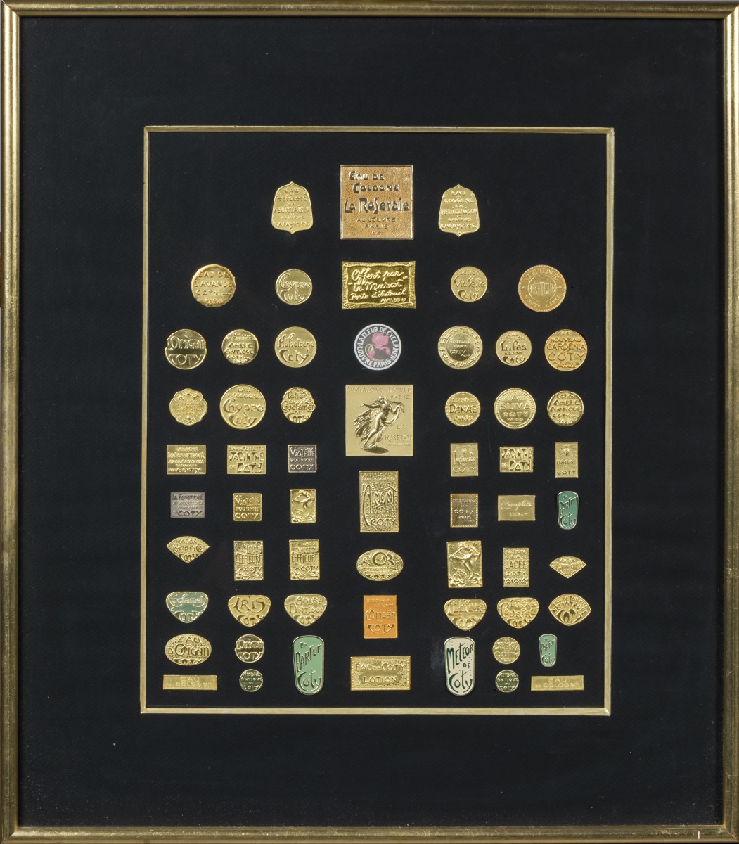 Importante et rare collection d'environ 60 étiquettes en papier gaufré et doré à chaud provenant de l'atelier des cartonnages Coty situé sur l'Ile de Puteaux, certaines créées par René Lalique, présentée dans un encadrement sous verre.