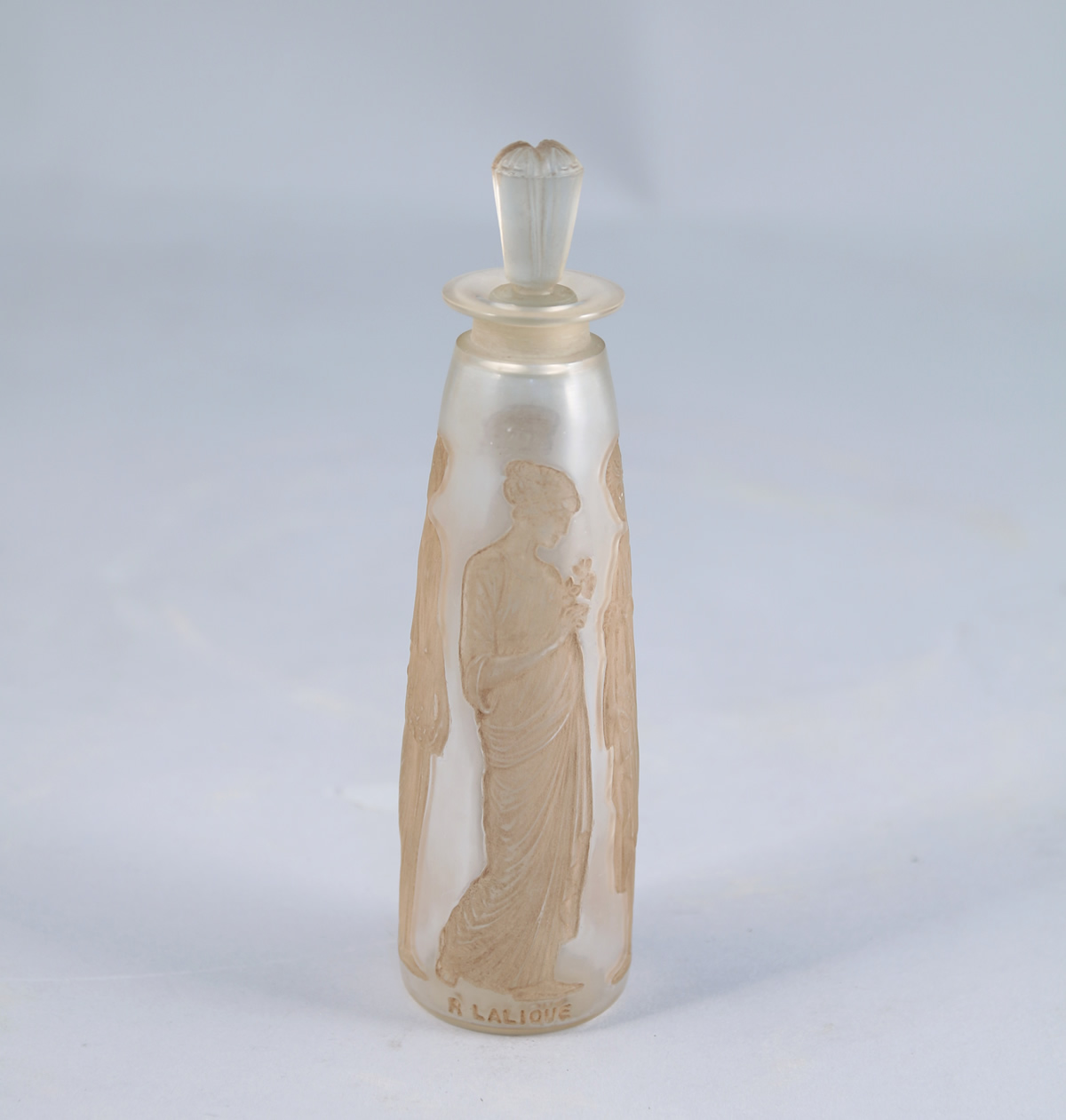 Flacon en verre incolore pressé moulé dépoli satiné de section cylindrique, sa panse à décor moulé en creux de quatre vestales drapées, col à carnette saillante, coiffé de son bouchon "pistil" , l'ensemble du décor patiné bistre.