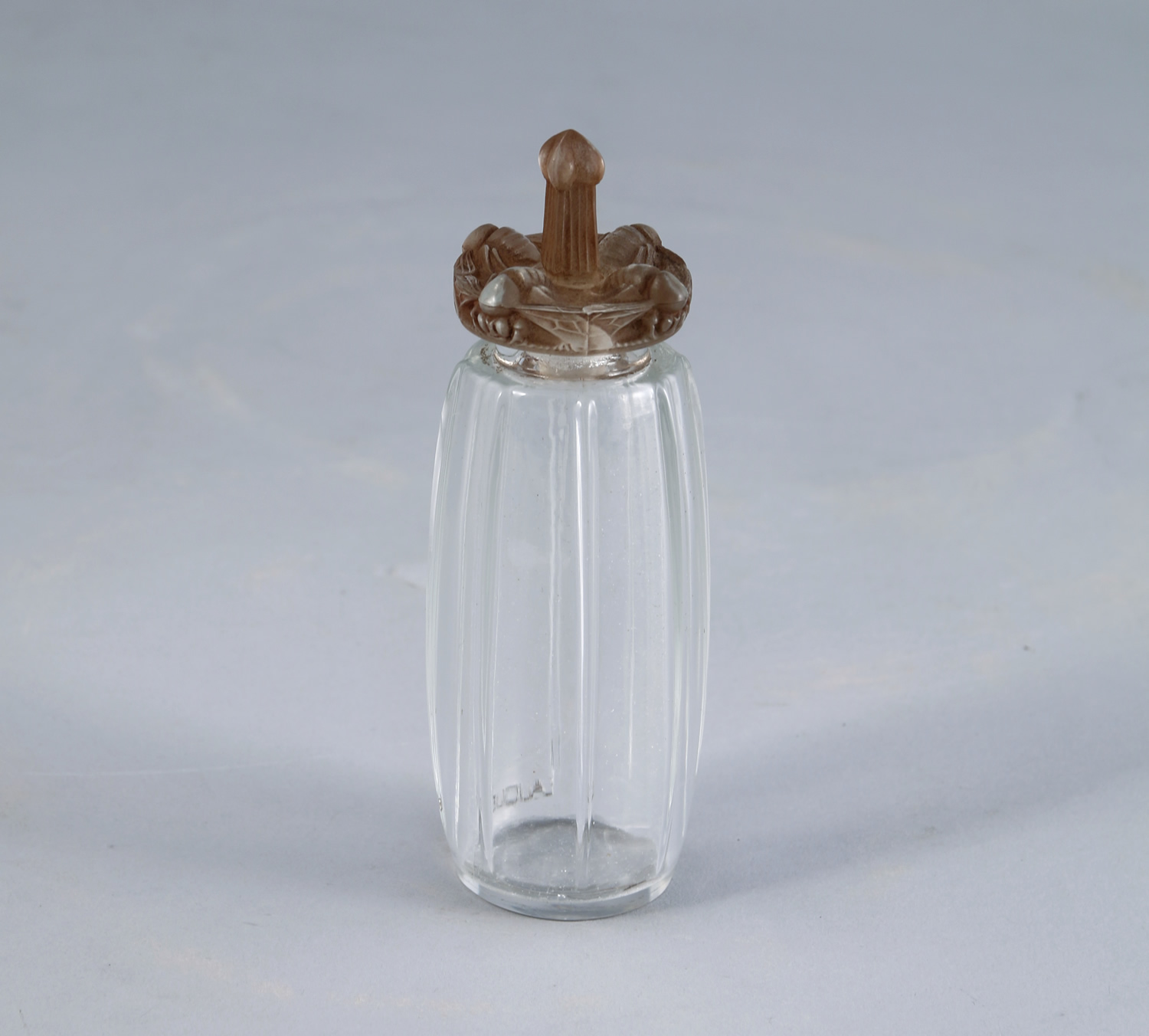 Flacon en verre incolore pressé moulé de section cylindrique, sa panse rainurée surmontée de sa carnette à décor moulé de guêpes patinées anthracites, son bouchon patiné figurant un pistil. (petite restauration).