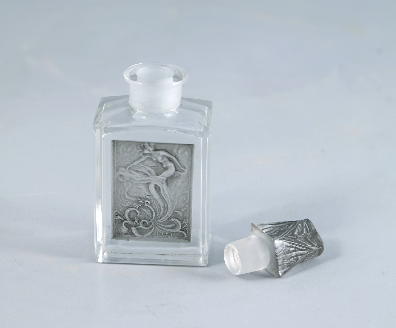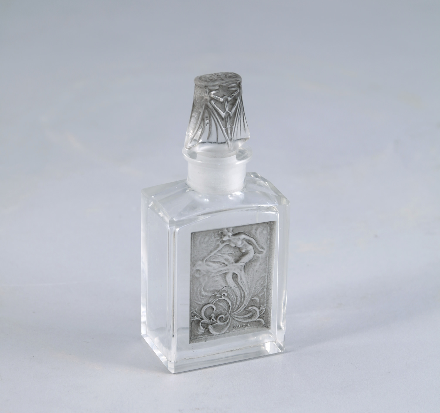 Flacon en verre incolore pressé moulé de section rectangulaire, panse cubique, une face à décor moulé en réserve d'une figurine sur fond de pétales et volutes dépolis légèrement patinés, col à carnette saillante, coiffé de son bouchon patiné figurant deux cigales affrontées.