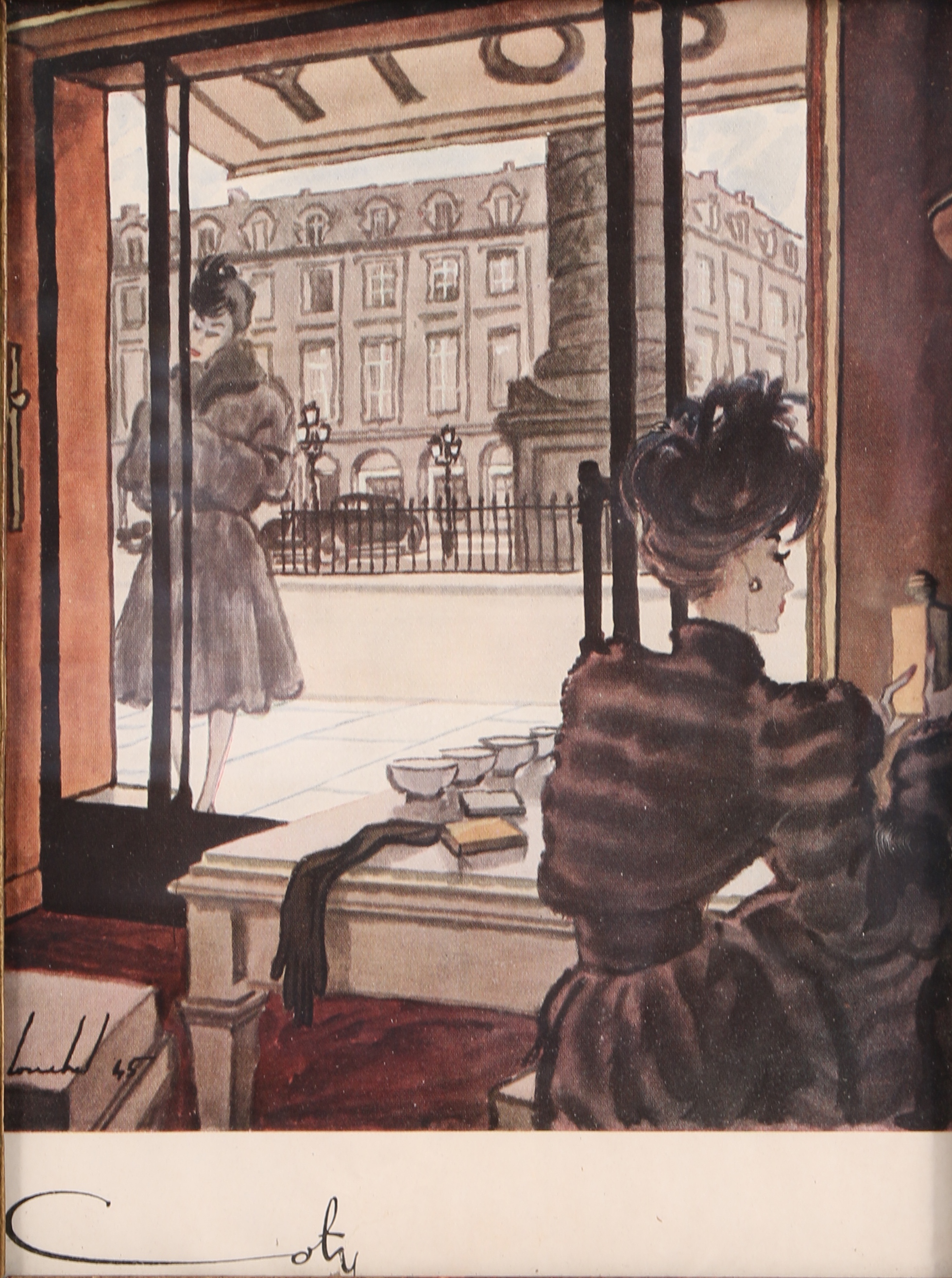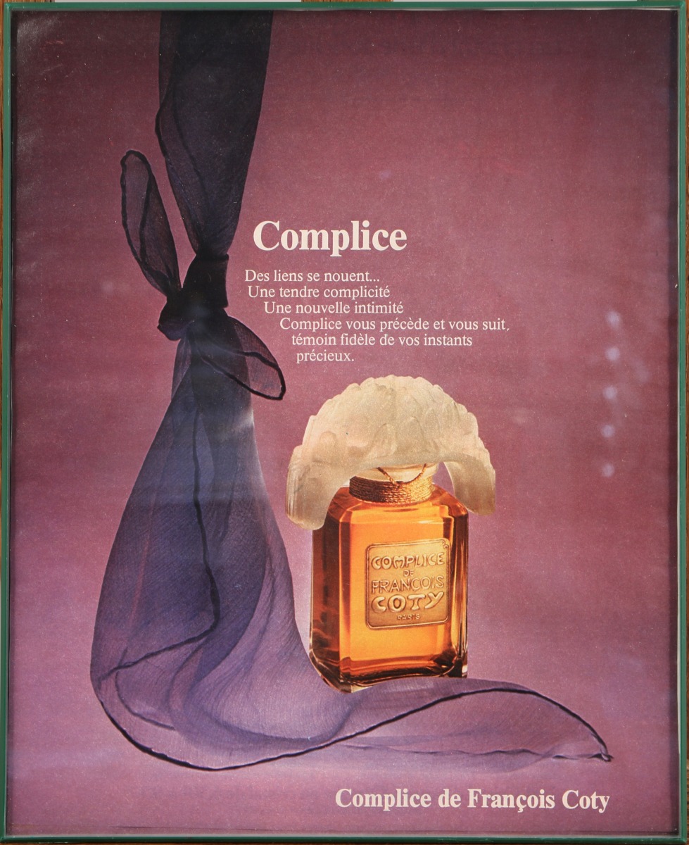 Trois publicités anciennes provenant de magazine: une illustrée polychrome de l'intérieur du magasin des Parfums Coty place Vendôme, une créée pour le parfum "Chypre" et une créée pour le lancement du parfum "Complice" .