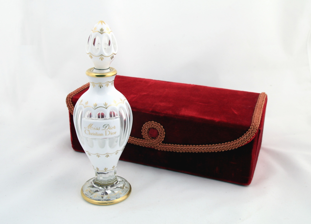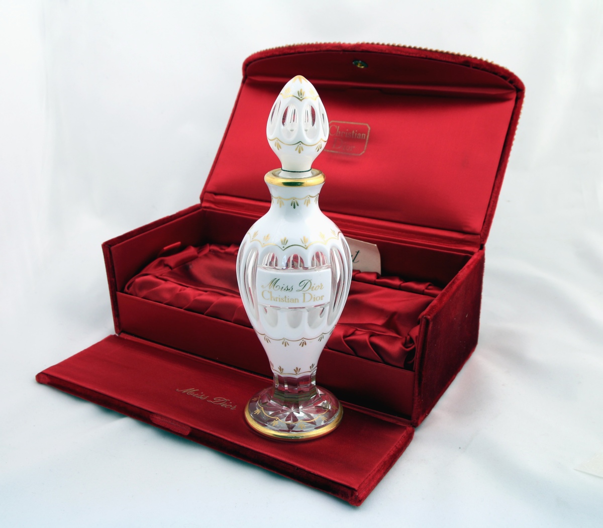 Présenté dans son coffret rectangulaire en carton gainé de velours rouge rubis galonné, intérieur satin plissé, titré, flacon amphore sur piedouche étoilé en cristal double blanc opaque et incolore de Baccarat rehaussé de laque or, titré sur cartouche, coiffé de son bouchon olive assorti, numéroté.