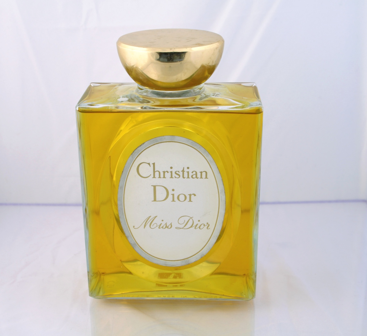Flacon publicitaire décoratif datant des années 1970 en verre incolore pressé moulé de section rectangulaire, sa panse cubique ornée de son étiquette en réserve, coiffé de son bouchon en surlyn or.