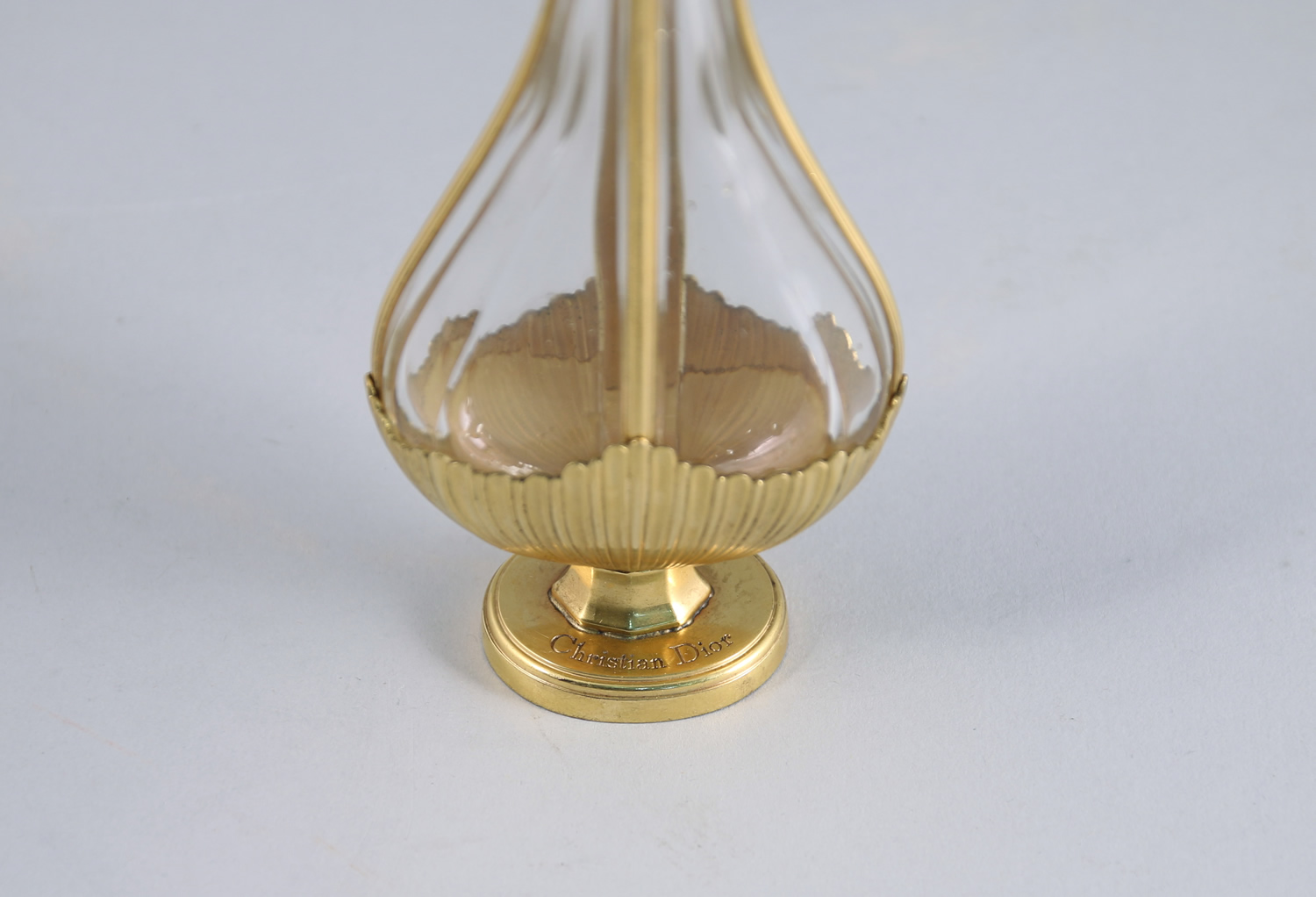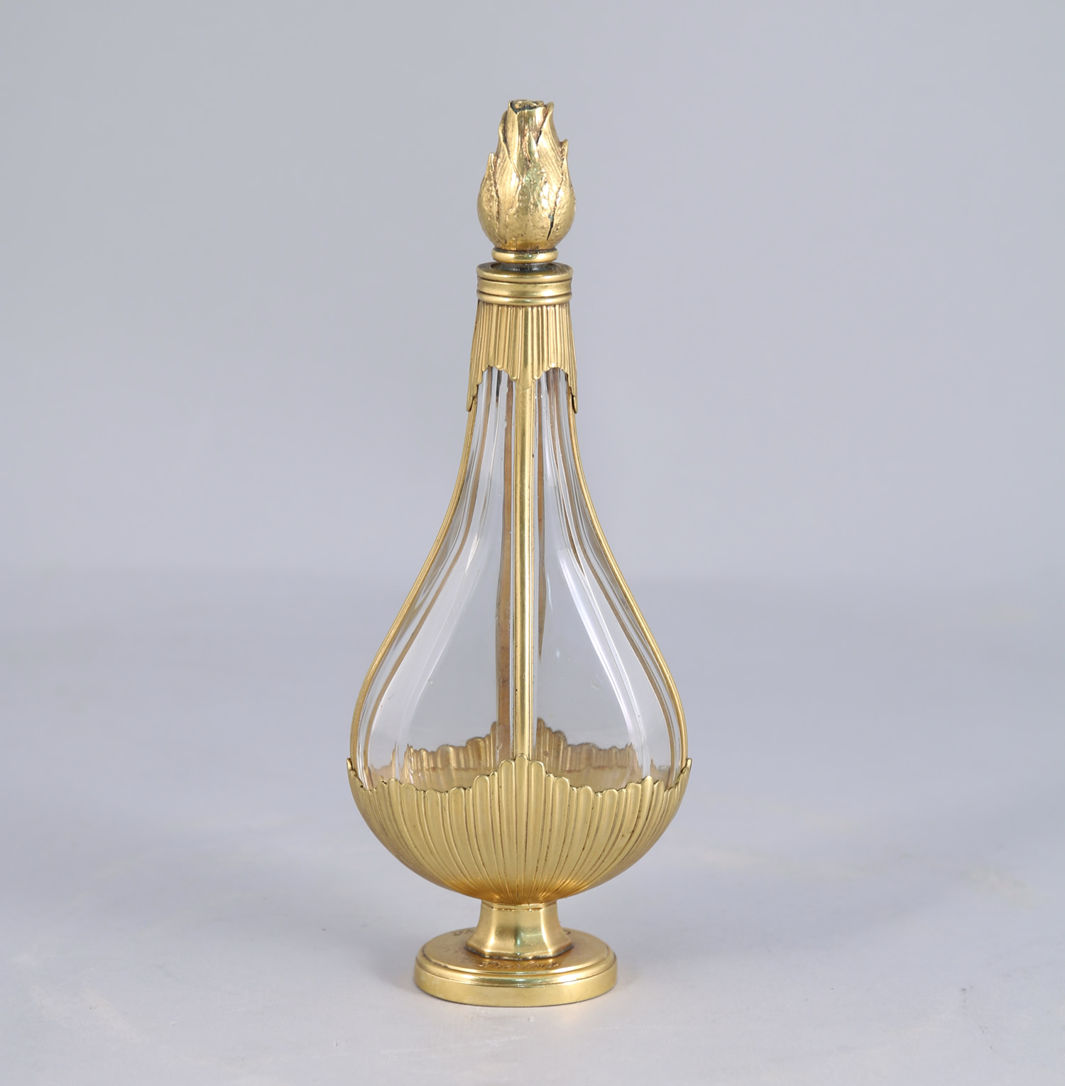 Luxueux flacon en cristal incolore pressé moulé de Baccarat carrossé de bronze doré figurant une amphore sur piedouche à décor de deux coquilles style Louis XV, surmonté de son bouchon en bronze ciselé figurant un bouton de rose. Titré sur le piedouche et numéroté. Monture en bronze crée par la Maison Charles à Paris.