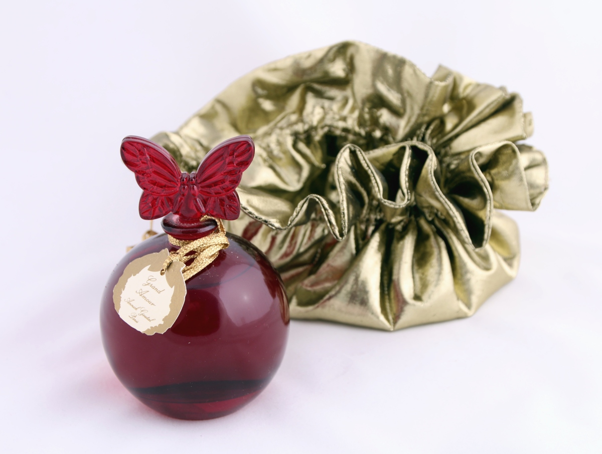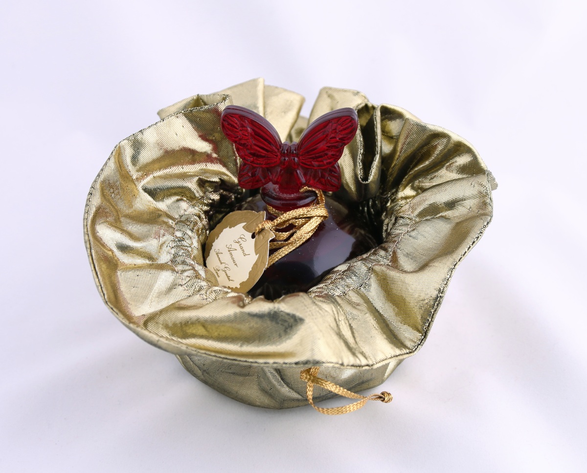 Même modèle de flaconnage que celui du lot précédent mais en verre teinté rouge rubis, présenté dans son aumonière en velours. scellé avec PdO.
