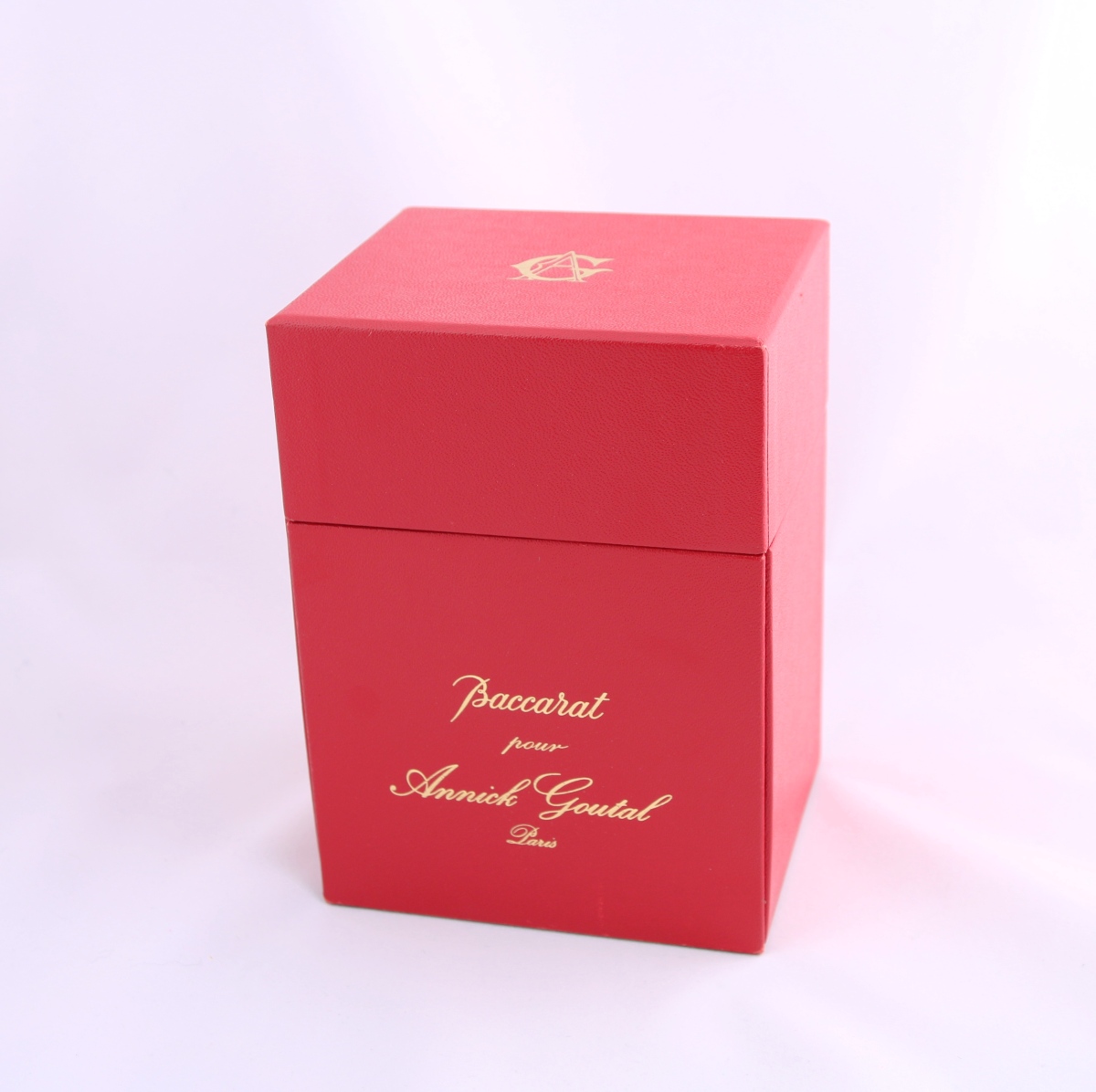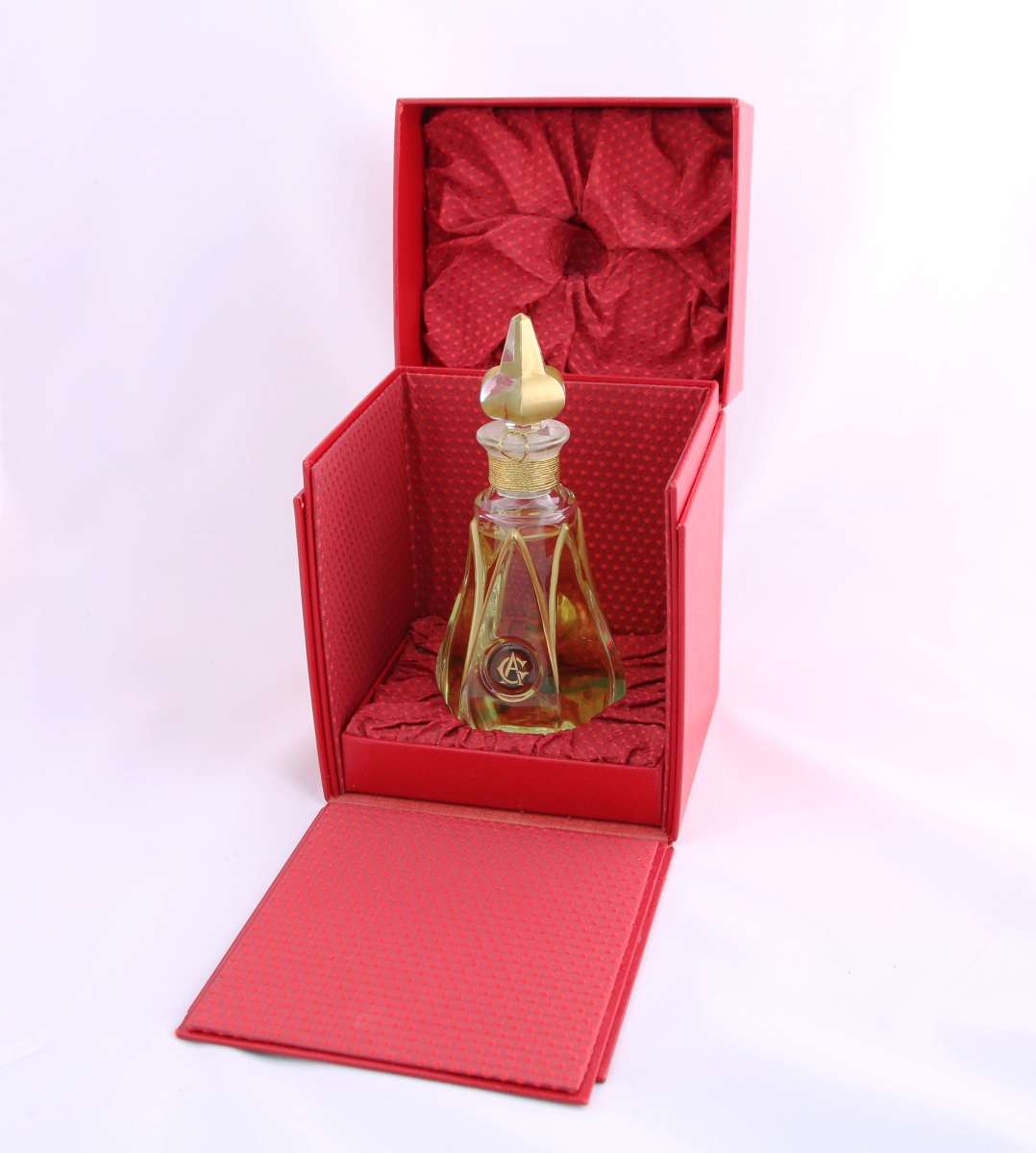 Présenté dans son coffret luxe en carton gainé de papier gaufré rouge, intérieur satin rouge, flacon en cristal incolore pressé moulé de section cylindrique, sa panse bulbeuse à pans coupés rehaussés à l'or, col à carnette dorée, coiffé de son bouchon "clochette" rehaussé à l'or. numéroté. scellé avec PdO.